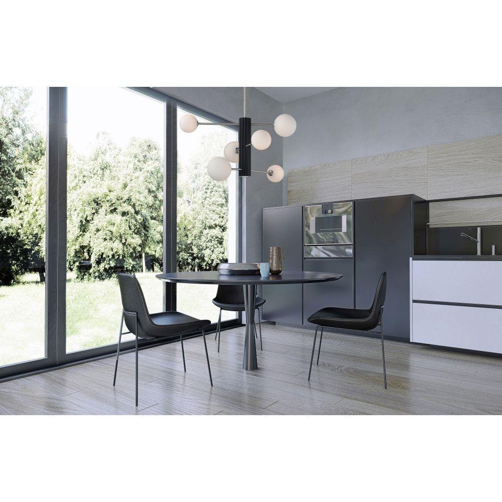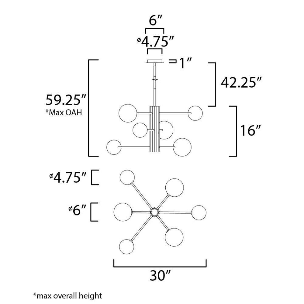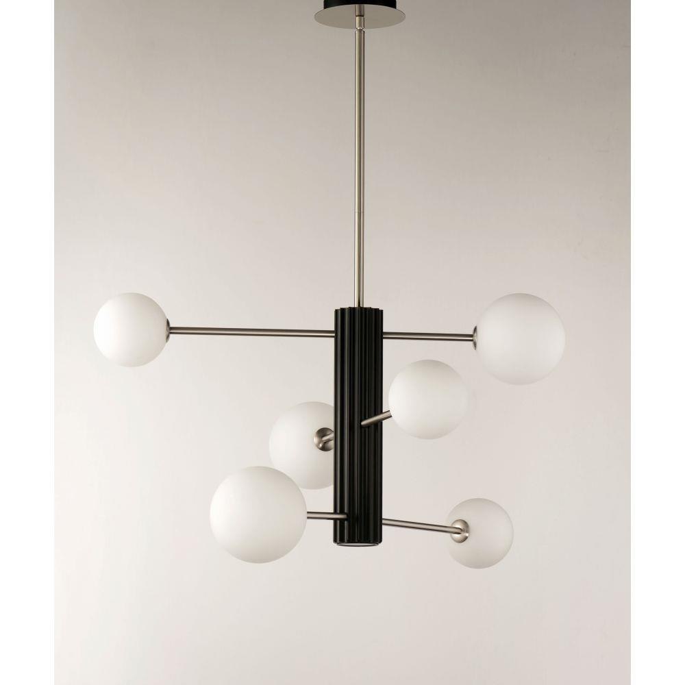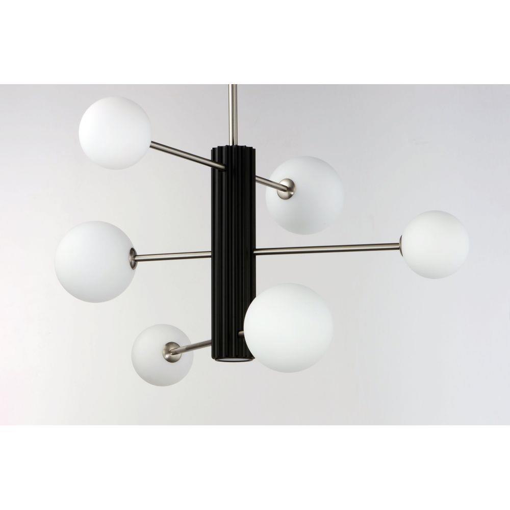 A scalloped aluminum extrusion is finished in Black with intersecting arms of Satin Nickel which support Satin White glass globes illuminated by LED G9 lamps that are included.