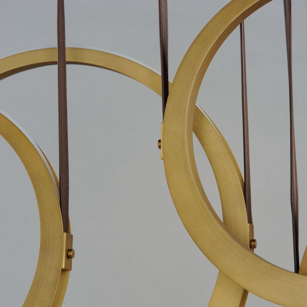 Tapered Antique Brass rings suspend from leather straps in this playful design. Within these rings, concealed LED light sources provide indirect light. This light casts light on neighboring rings while simultaneously illuminating the area above and below the fixture. Suitable for both modern and transitional settings.