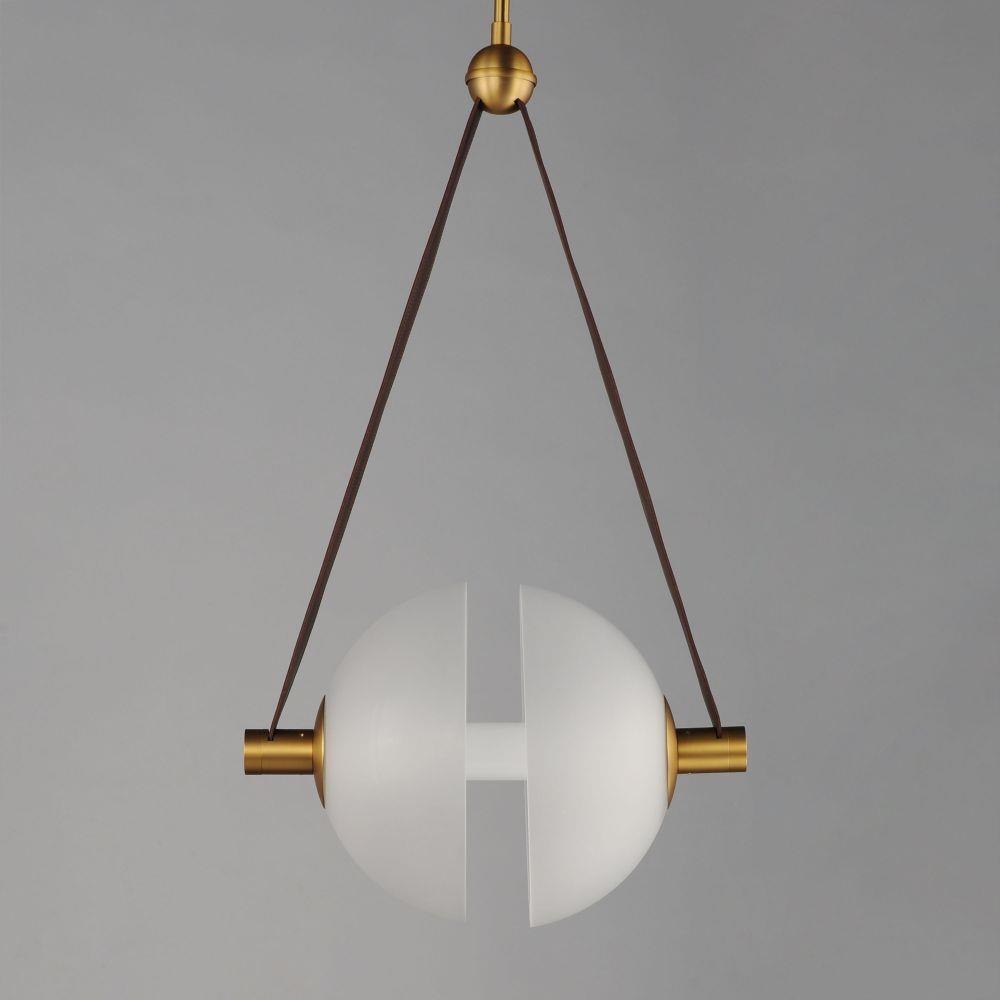 Send a message on the wire. Two semi-spherical frosted glass domes are separated by a tube of LED light and suspended by Tobacco Brown leather straps. The frames are complete in a contrasting Natural Aged Brass finish making the contemporary design softer and more applicable to traditional settings.