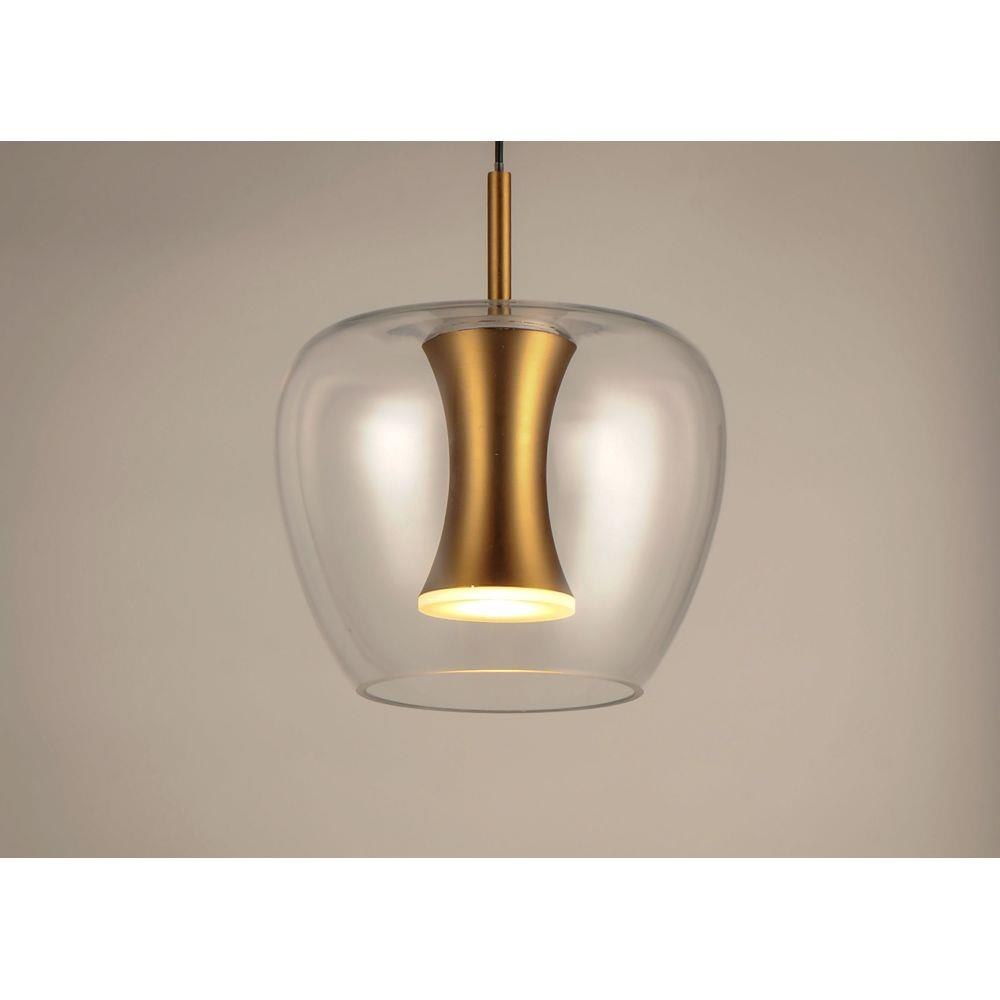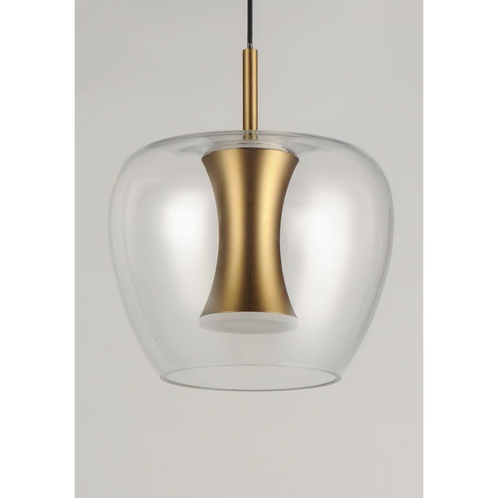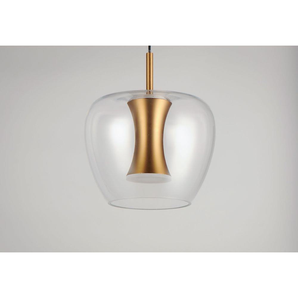 Clear apple shaped glass rest on machined aluminum fonts finished in Satin Brass with integrated LED for even Illumination without the glare. The large scale 25 light comes pre-arranged for ease of installation and is perfect for that tall ceiling application.