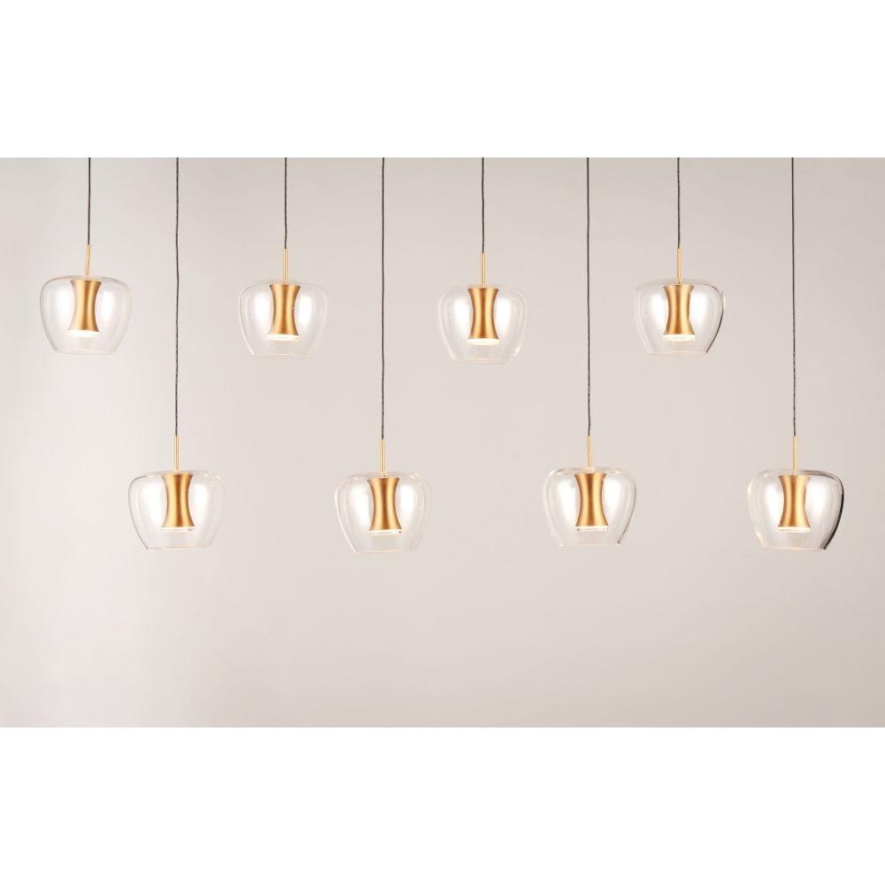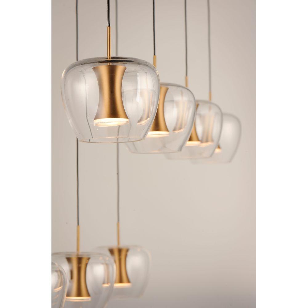 Clear apple shaped glass rest on machined aluminum fonts finished in Satin Brass with integrated LED for even Illumination without the glare. The large scale 25 light comes pre-arranged for ease of installation and is perfect for that tall ceiling application.
