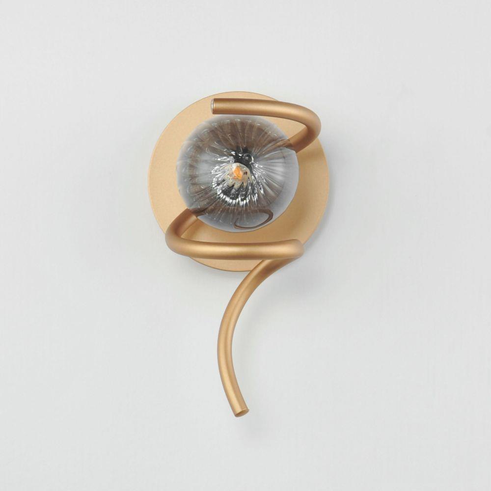 In a galaxy of light, ribbed and tinted glass is supported by swooping arcs of circular tubes. The Gold frame supports glass globe shades colored in Amber and Smoke tints that encase LED lamps provided. The single pendant has an over-sized spiraling glass shade in either Amber or Smoke, with a dome of light within and Matte Black components. Two configurations of wall sconces pair perfectly with the collection.