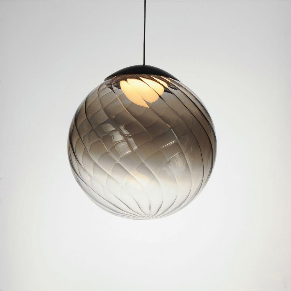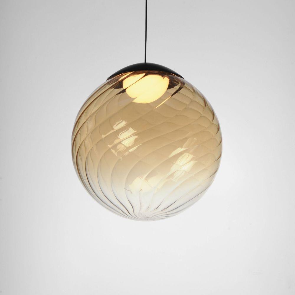 In a galaxy of light, ribbed and tinted glass is supported by swooping arcs of circular tubes. The Gold frame supports glass globe shades colored in Amber and Smoke tints that encase LED lamps provided. The single pendant has an over-sized spiraling glass shade in either Amber or Smoke, with a dome of light within and Matte Black components. Two configurations of wall sconces pair perfectly with the collection.