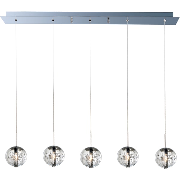 This 4" x 4" Orb Linear Pendant has an adjustable hanging height of 18" - 128". During the molten glass making process, bubble powder is introduced to create bubbles in the glass, giving the 5-light pendant a carbonated look. With a dry safety rating, this light fixture would go great in a kitchen or other low-humidity living areas in your home. Orb Collection Ablaze with xenon lamps radiating from the center of perfect spheres, the Orb Collection adds a sense of drama to any room. Clear bubble glass allows for a lustrous glow as light mimics the fluid play of water and air. Bordered with a Polished Chrome frame, the fixture mesmerizes onlookers with an innate mystery. Who is ET2? Featuring over 6, 000 luxury lighting products, ET2 is an established brand known for innovative solutions. Choose ET2 lighting to express your unique style, each piece is a work of art designed with contemporary materials and the latest trends.