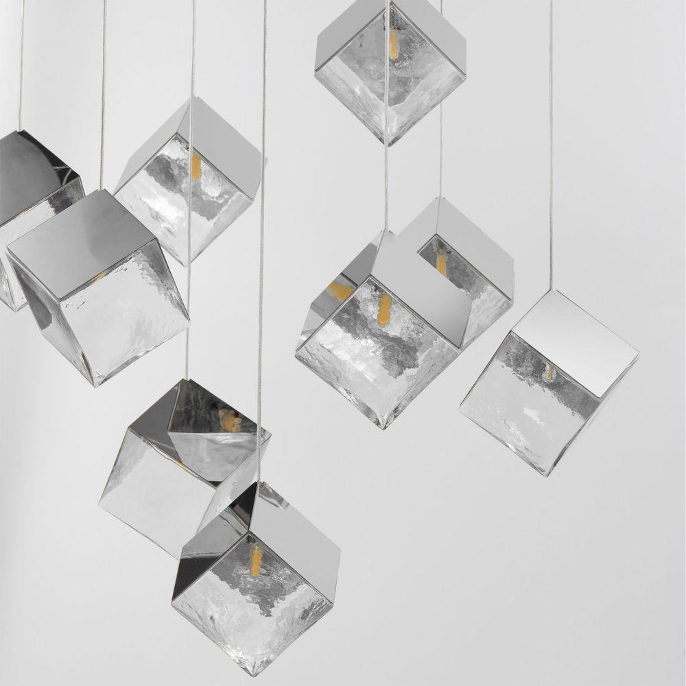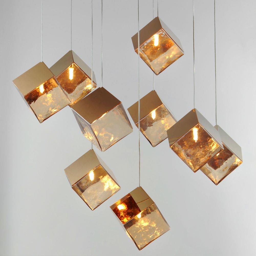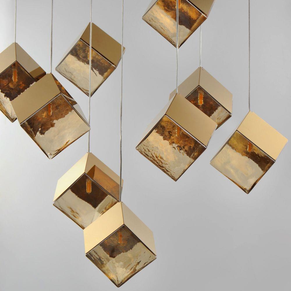 Like melting ice, these oversized cube pendants support cast glass shades from highly polished stainless steel frames. Select from two finish combinations: a Clear glass shade and Polished Chrome frame or soften the look with warm Amber glass and a polished French Gold frame. Available in a variety of configurations, these pendants will make your space cool.