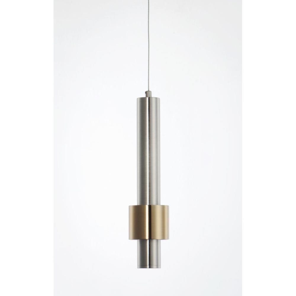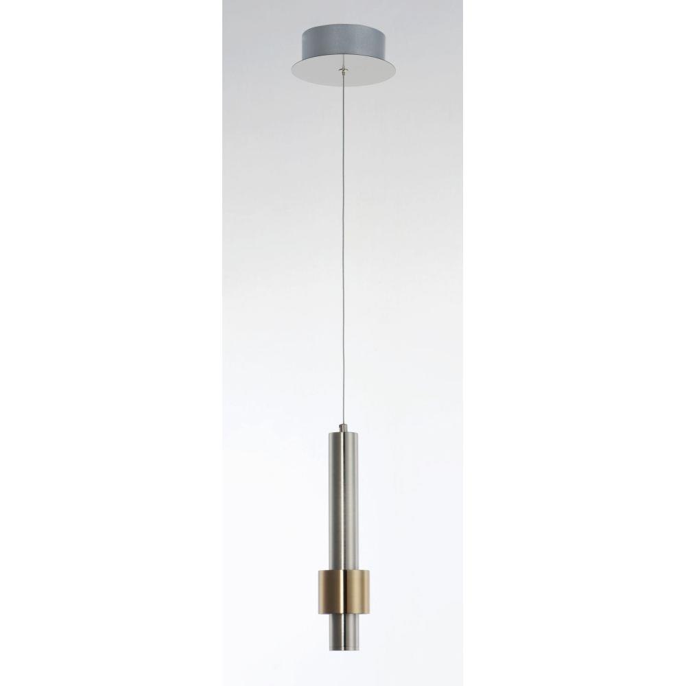 Tubular shaped pendants finished in Satin Nickel with a Satin Brass band provide light from the bottom as well as a reveal behind the band. The soft glow of light from the band creates a beautiful lighting effect not normally seen from similar pendants.