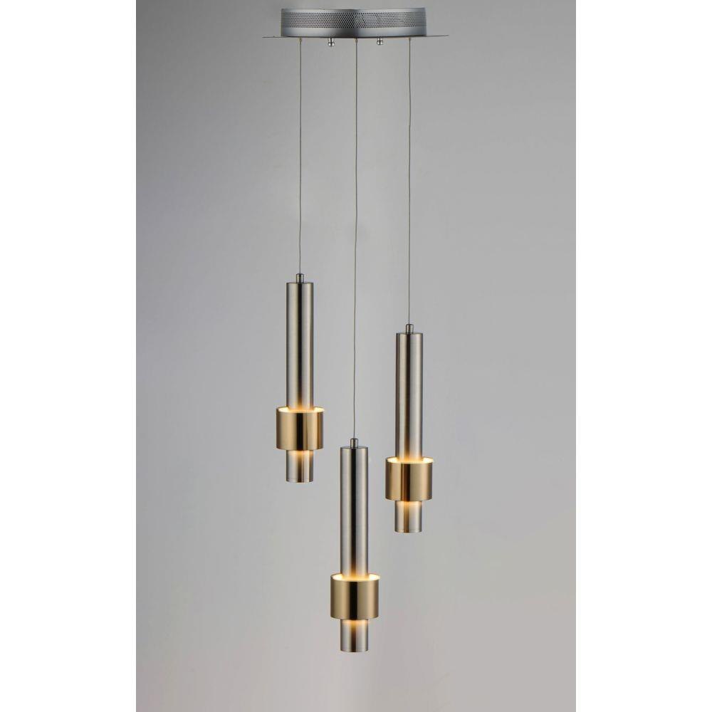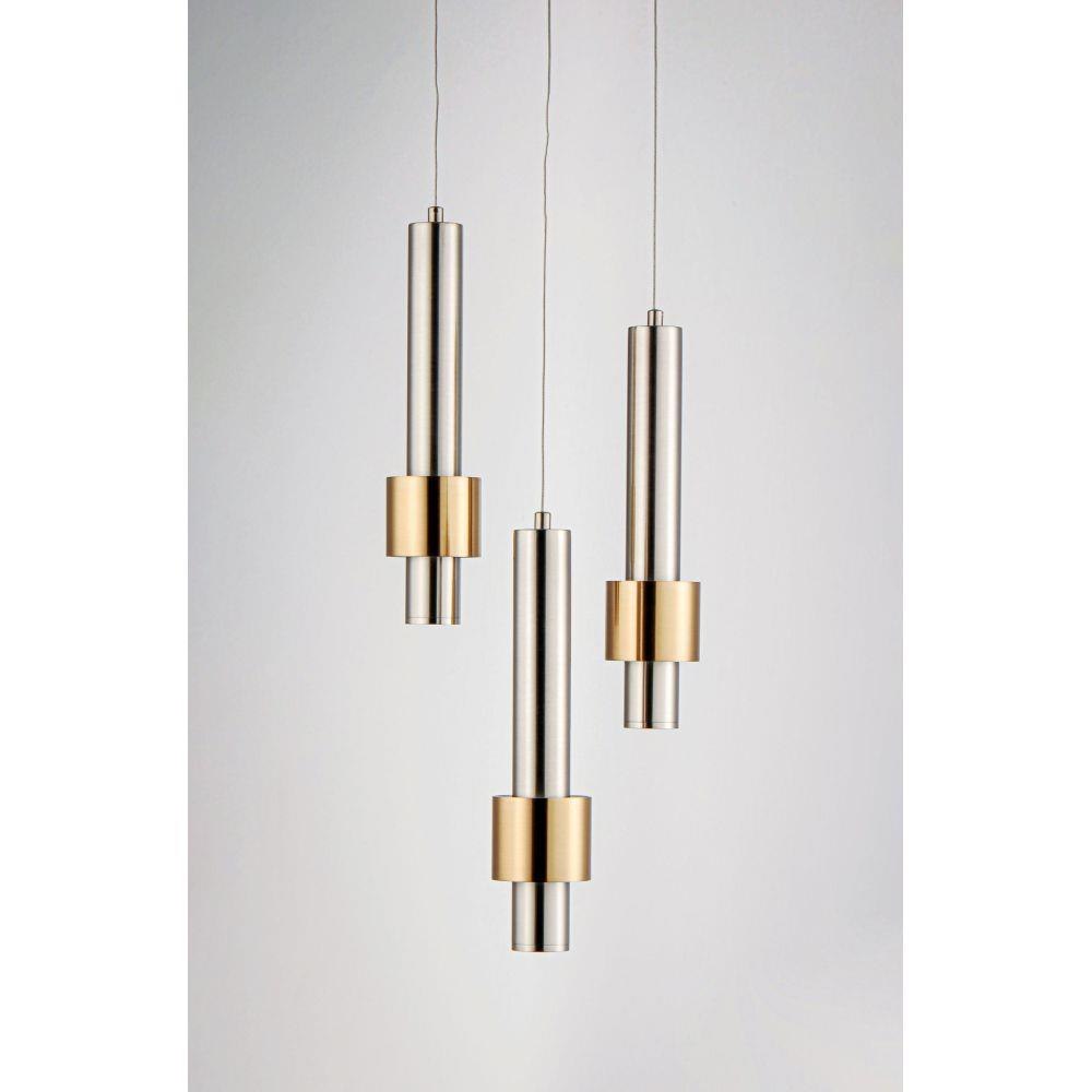Tubular shaped pendants finished in Satin Nickel with a Satin Brass band provide light from the bottom as well as a reveal behind the band. The soft glow of light from the band creates a beautiful lighting effect not normally seen from similar pendants.