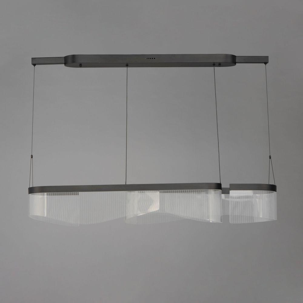 Composed of gently curving aluminum channels in Matte Black that support a patterned translucent acrylic arranged in groups of vertical stripes, this series of pendants and coordinating ADA sconce express a musical quality in brilliant LED light. The wall sconce visibly suggests the shape of a piano, while the pendants return inward where they bend at the ends in an instrumental, elegant shape. A story told in simple forms, the collection is illuminated by dedicated LED light sources concealed within the frames enhancing the translucent undulating slabs of patterned acrylic. Their sculptural form is sure to add wonder to both classical and modern settings.