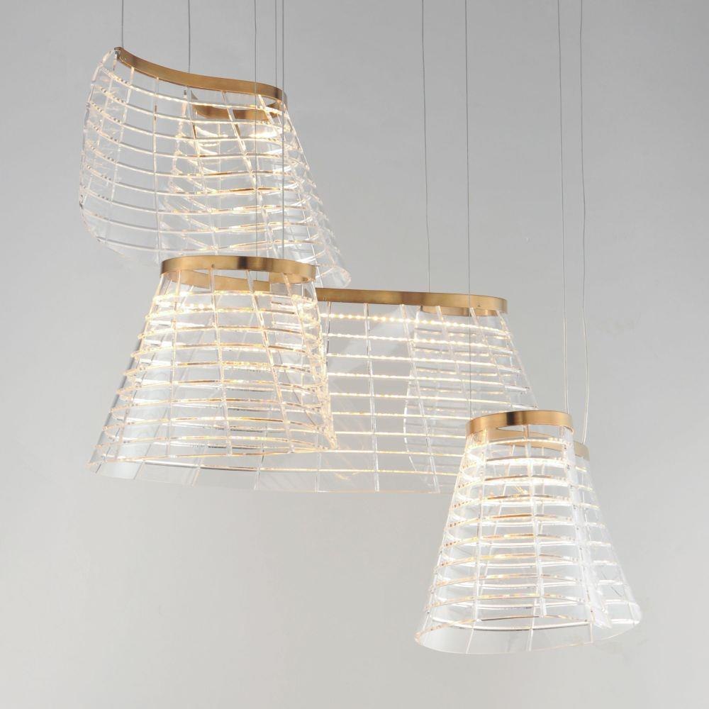 Inspired by patterned fabrics of the Scottish Highlands, the Tartan collection features a waving grid-like design etched deep into the transparent acrylic body. Hand-formed into a curling structure, the material gives the impression of billowing in the breeze. Color temperature selection at the canopy allows you to choose from Warm, Neutral, and Cool White colored LED lighting.