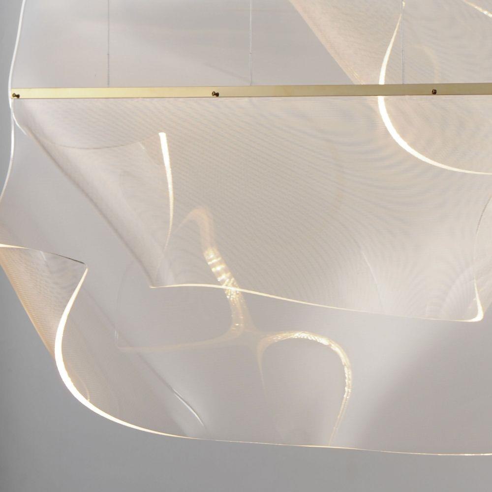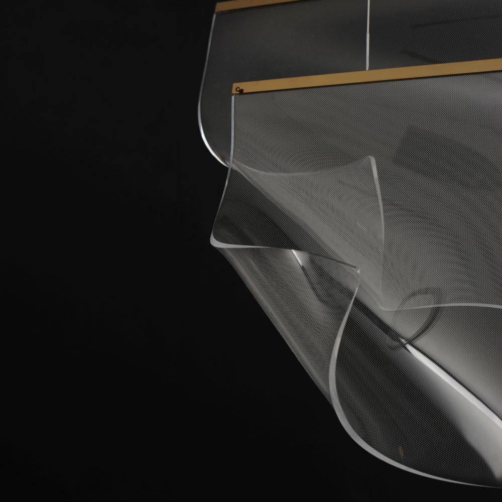 An airy arrangement of abstract forms, the Rinkle pendants feature sheets of transparent acrylic shaped by hand. The light guided acrylic captures the glow of energy efficient LEDs recessed within strips of shining stainless steel, obscuring the source of illumination. Delicately suspended by a series of thin wires, the pendants appear to be floating in an adjustable configuration of weightless light sculpture. Available in Polished Chrome, French Gold, and Brushed Gunmetal, its unique design adds a showstopping element to interior spaces.