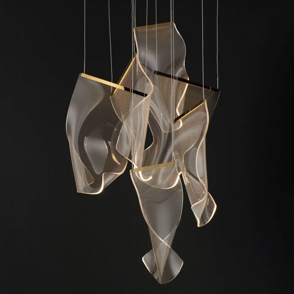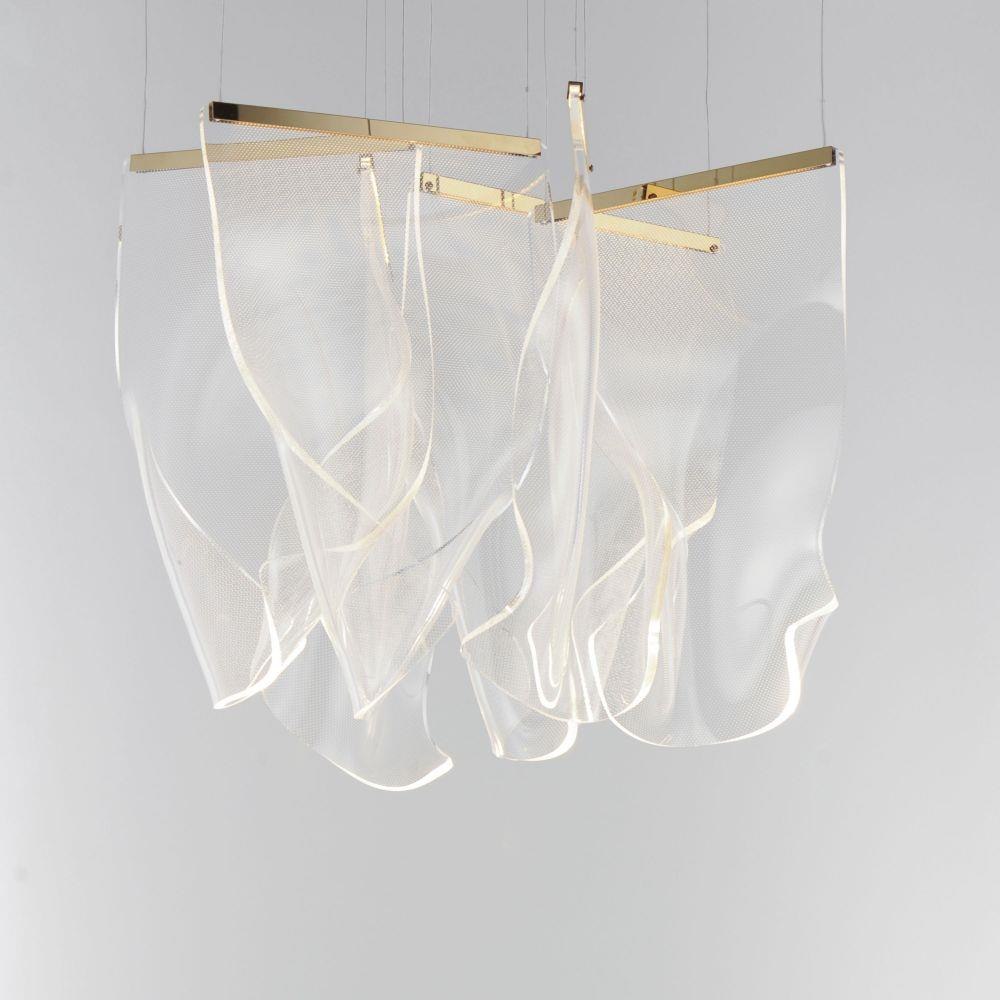 An airy arrangement of abstract forms, the Rinkle pendants feature sheets of transparent acrylic shaped by hand. The light guided acrylic captures the glow of energy efficient LEDs recessed within strips of shining stainless steel, obscuring the source of illumination. Delicately suspended by a series of thin wires, the pendants appear to be floating in an adjustable configuration of weightless light sculpture. Available in Polished Chrome, French Gold, and Brushed Gunmetal, its unique design adds a showstopping element to interior spaces.