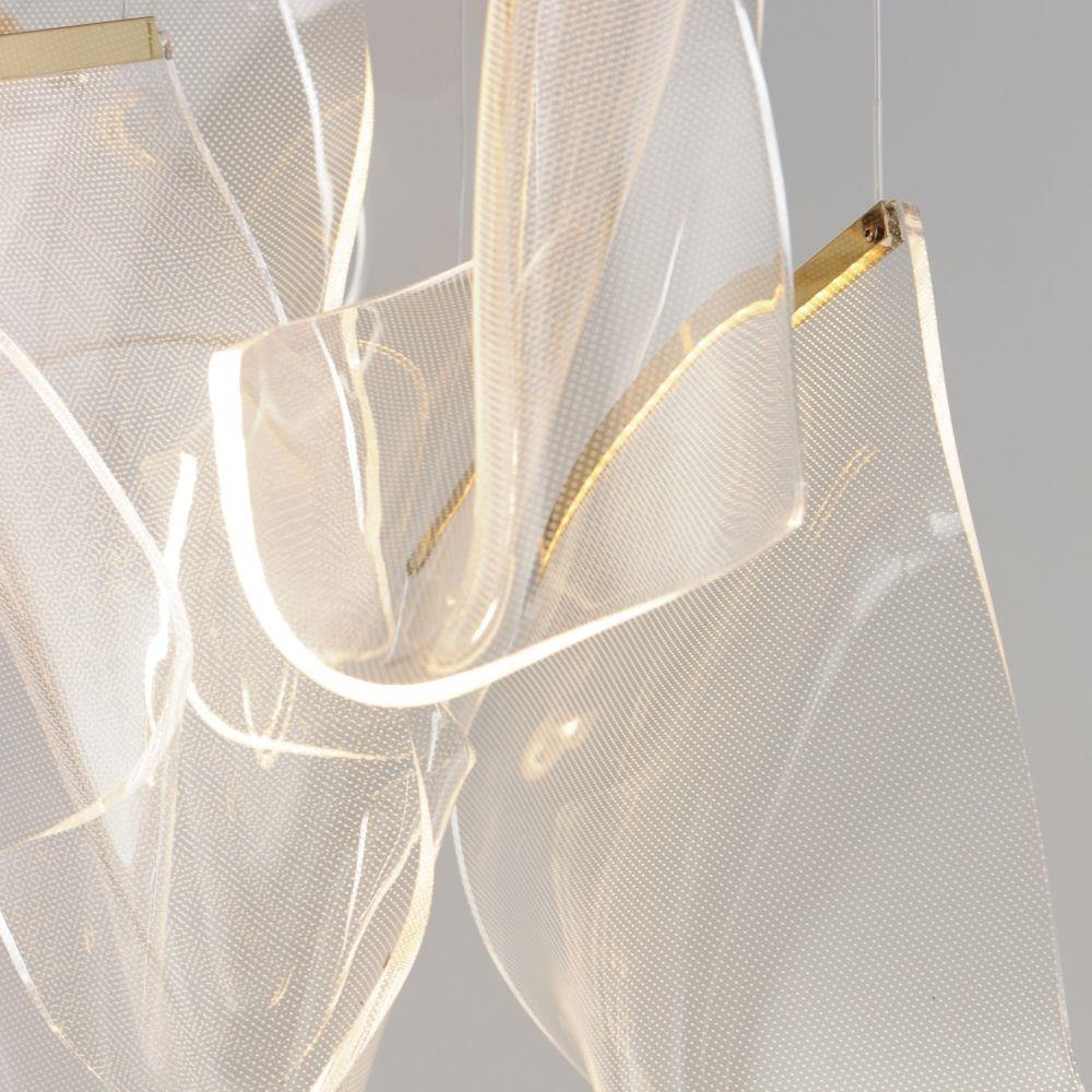 An airy arrangement of abstract forms, the Rinkle pendants feature sheets of transparent acrylic shaped by hand. The light guided acrylic captures the glow of energy efficient LEDs recessed within strips of shining stainless steel, obscuring the source of illumination. Delicately suspended by a series of thin wires, the pendants appear to be floating in an adjustable configuration of weightless light sculpture. Available in Polished Chrome, French Gold, and Brushed Gunmetal, its unique design adds a showstopping element to interior spaces.