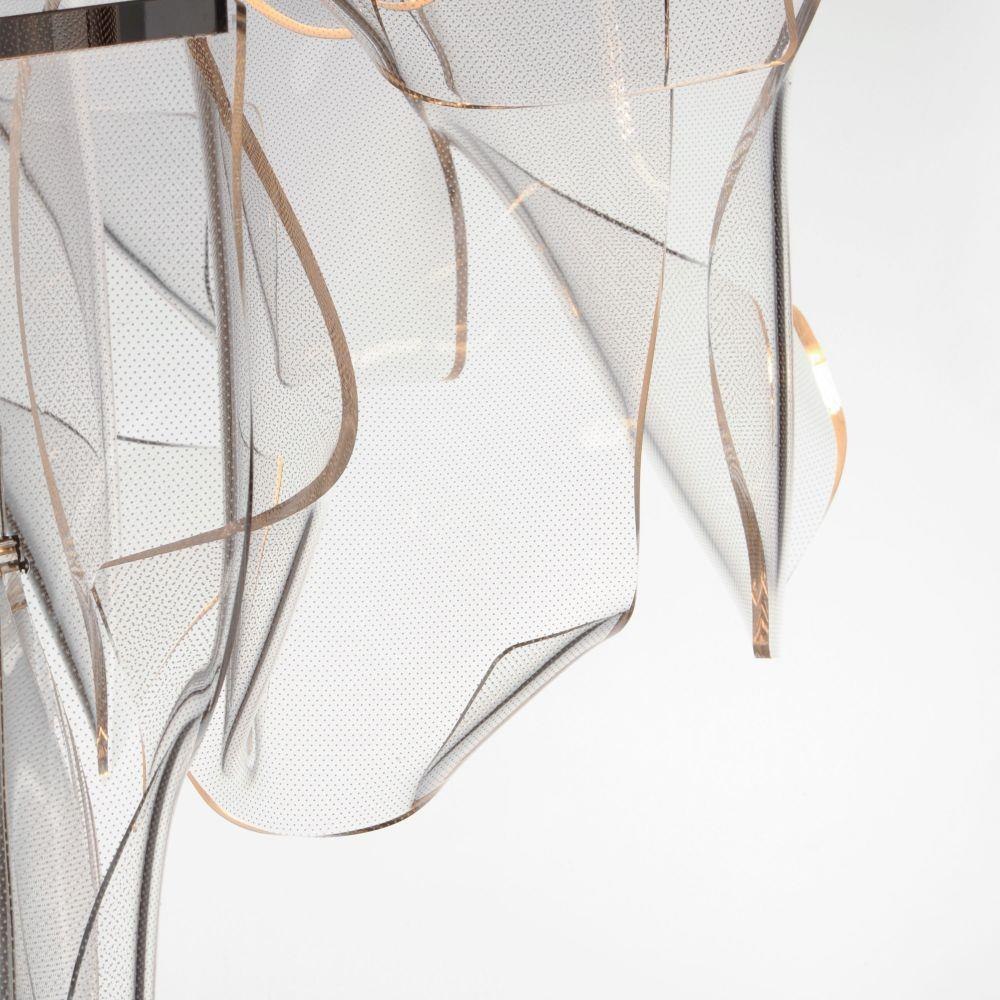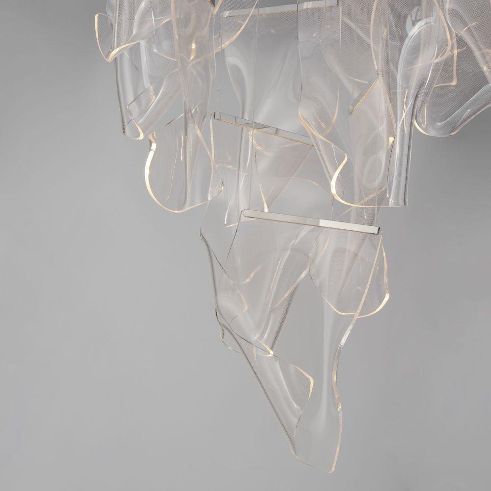 An airy arrangement of abstract forms, the Rinkle pendants feature sheets of transparent acrylic shaped by hand. The light guided acrylic captures the glow of energy efficient LEDs recessed within strips of shining stainless steel, obscuring the source of illumination. Delicately suspended by a series of thin wires, the pendants appear to be floating in an adjustable configuration of weightless light sculpture. Available in Polished Chrome and Brushed Gunmetal, its unique design adds an artistic statement to a variety of interiors with complimentary finishes.
