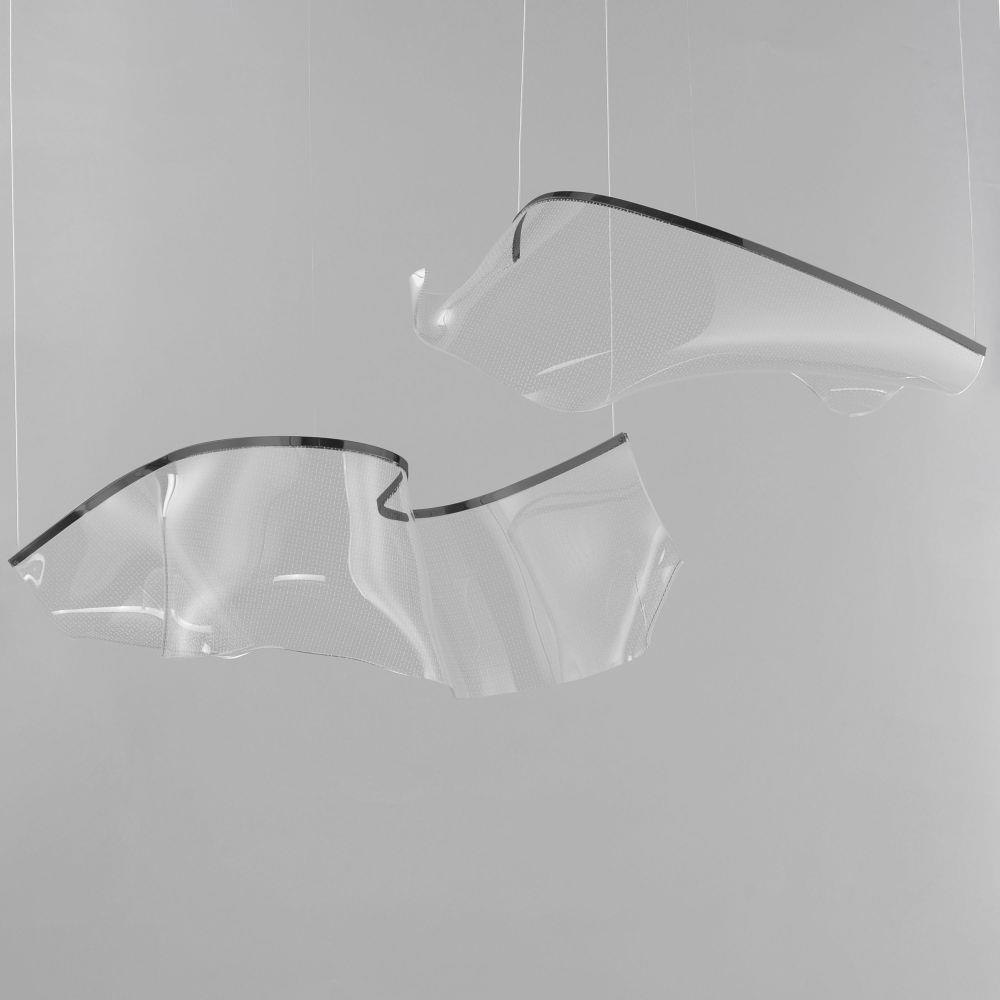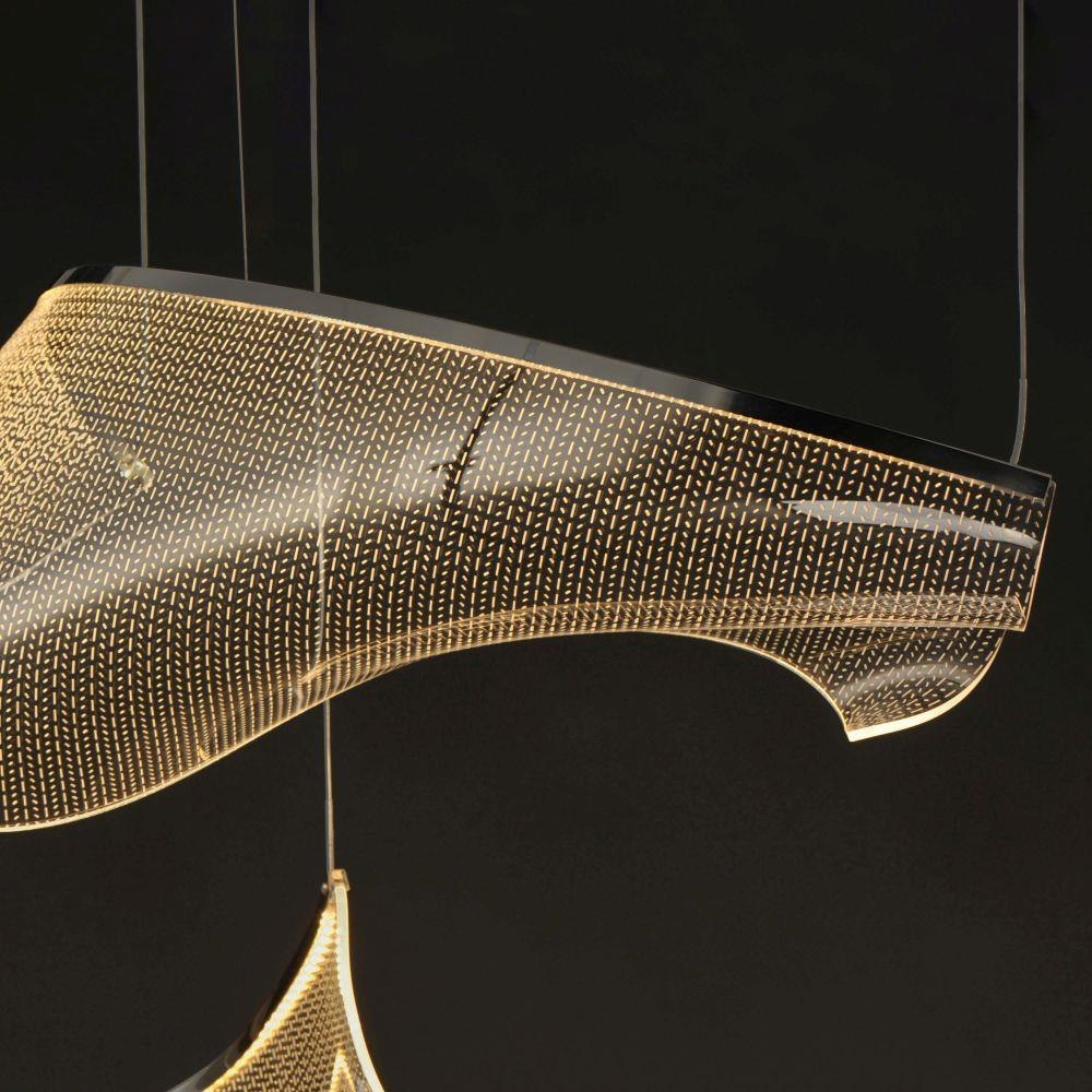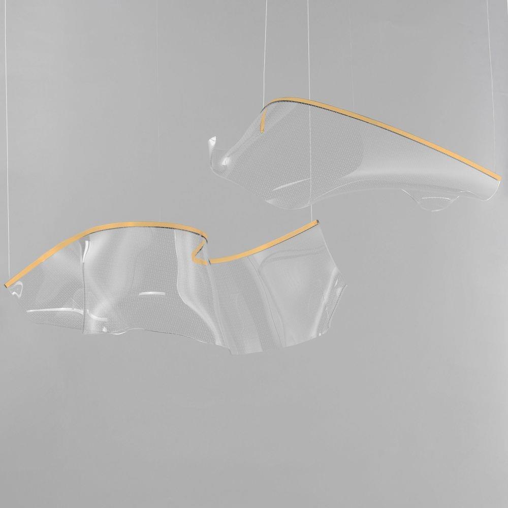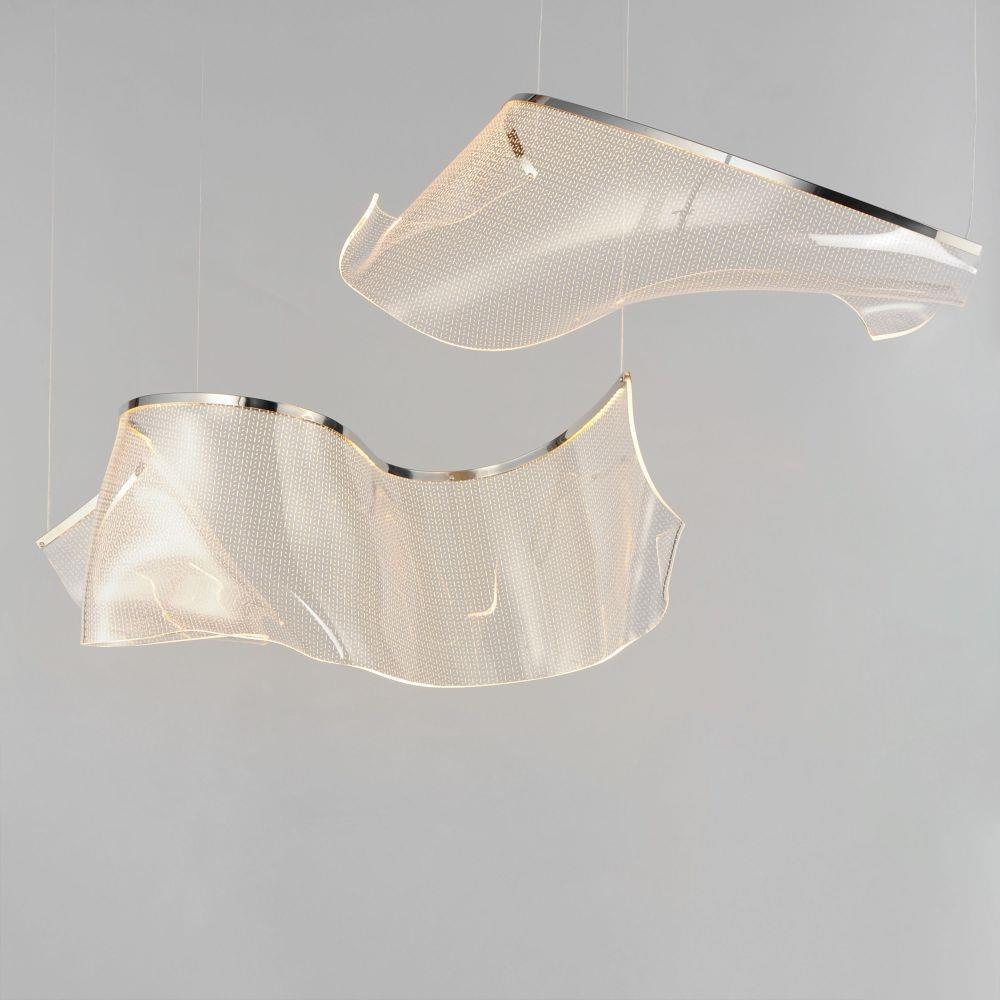 An airy arrangement of abstract forms, the Rinkle pendants feature sheets of transparent acrylic shaped by hand. The light guided acrylic captures the glow of energy efficient LEDs recessed within strips of shining stainless steel, obscuring the source of illumination. Delicately suspended by a series of thin wires, the pendants appear to be floating in an adjustable configuration of weightless light sculpture. Available in Polished Chrome, French Gold, and Brushed Gunmetal, its unique design adds a showstopping element to interior spaces.