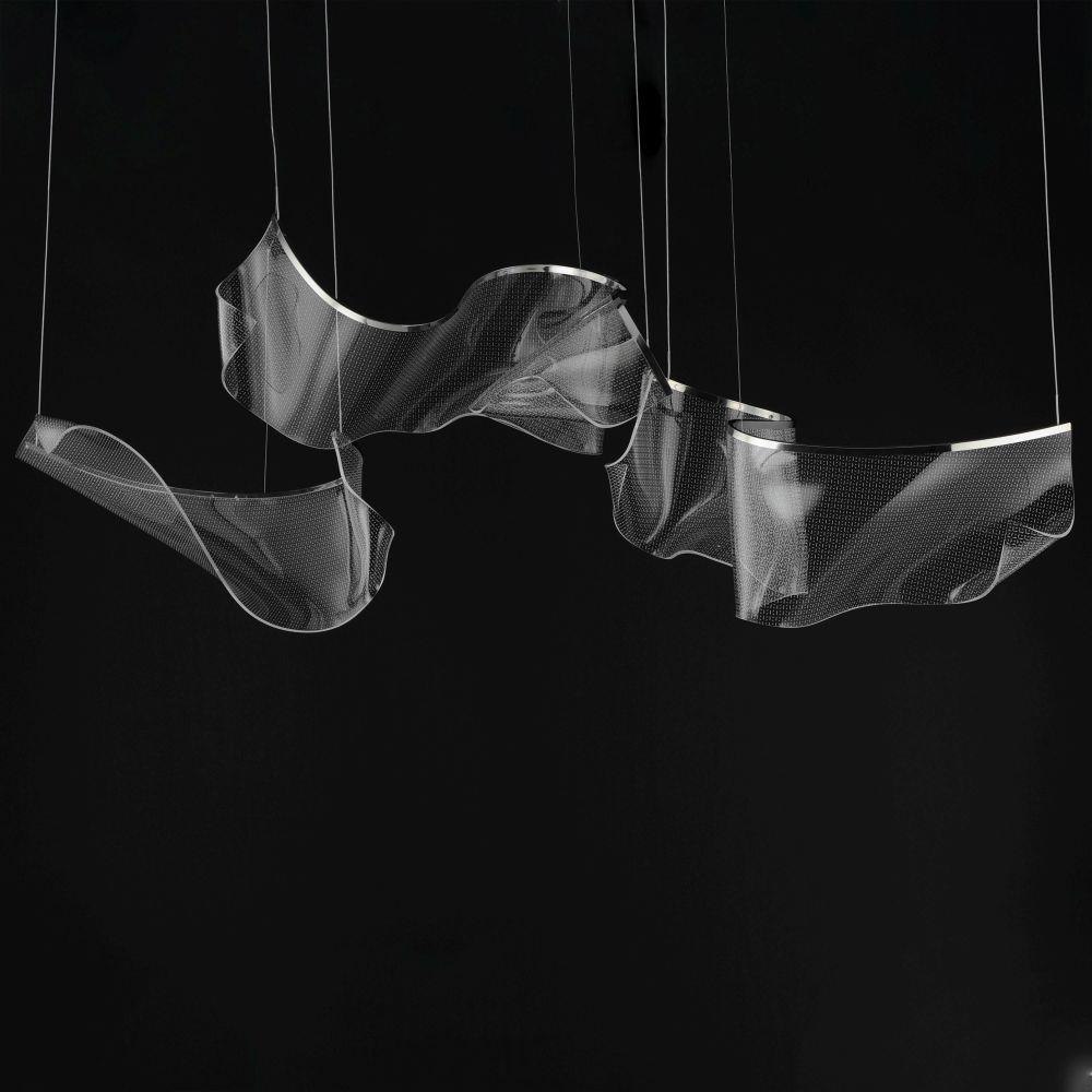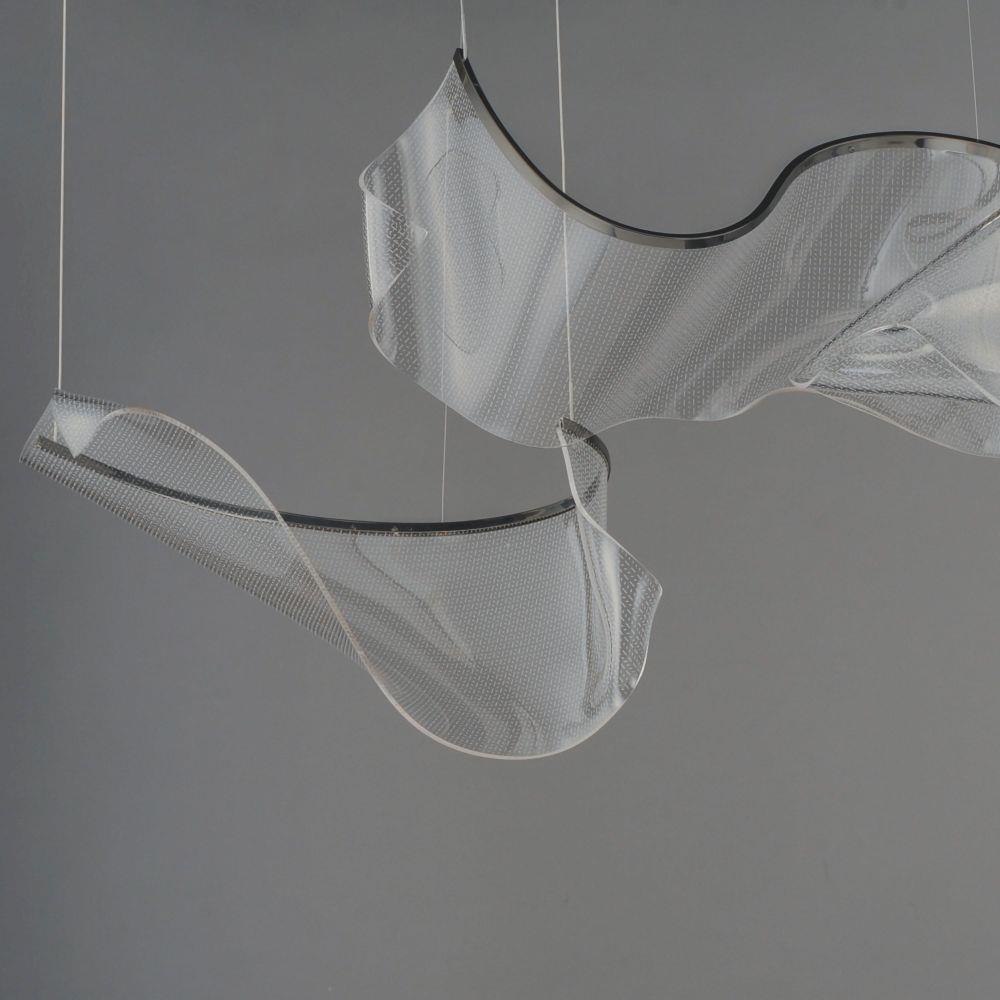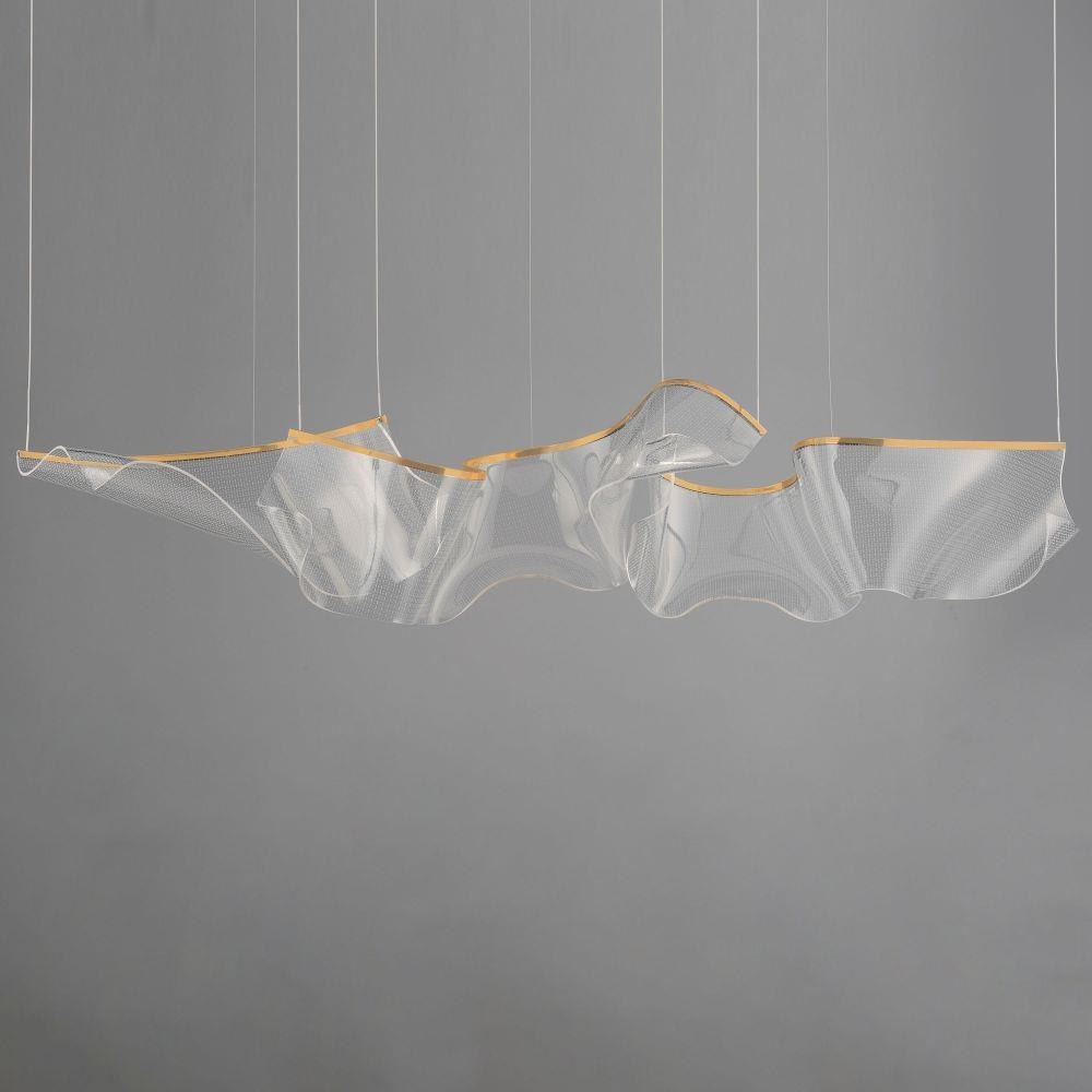 An airy arrangement of abstract forms, the Rinkle pendants feature sheets of transparent acrylic shaped by hand. The light guided acrylic captures the glow of energy efficient LEDs recessed within strips of shining stainless steel, obscuring the source of illumination. Delicately suspended by a series of thin wires, the pendants appear to be floating in an adjustable configuration of weightless light sculpture. Available in Polished Chrome, French Gold, and Brushed Gunmetal, its unique design adds a showstopping element to interior spaces.