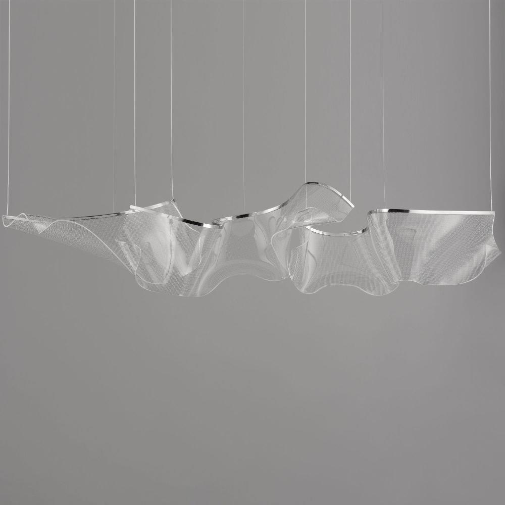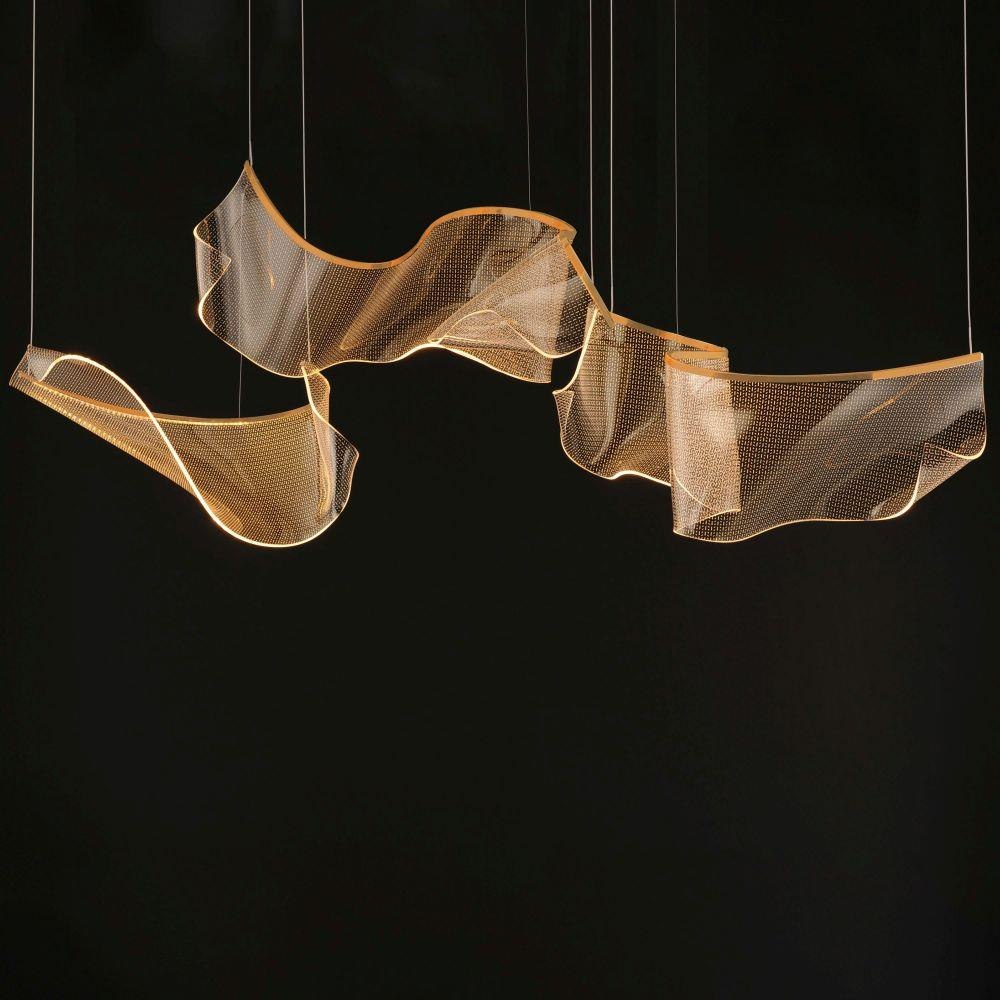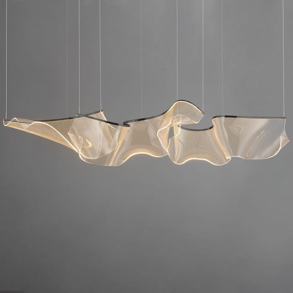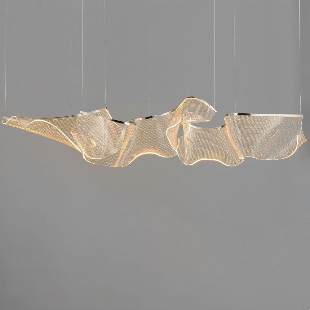 An airy arrangement of abstract forms, the Rinkle pendants feature sheets of transparent acrylic shaped by hand. The light guided acrylic captures the glow of energy efficient LEDs recessed within strips of shining stainless steel, obscuring the source of illumination. Delicately suspended by a series of thin wires, the pendants appear to be floating in an adjustable configuration of weightless light sculpture. Available in Polished Chrome, French Gold, and Brushed Gunmetal, its unique design adds a showstopping element to interior spaces.
