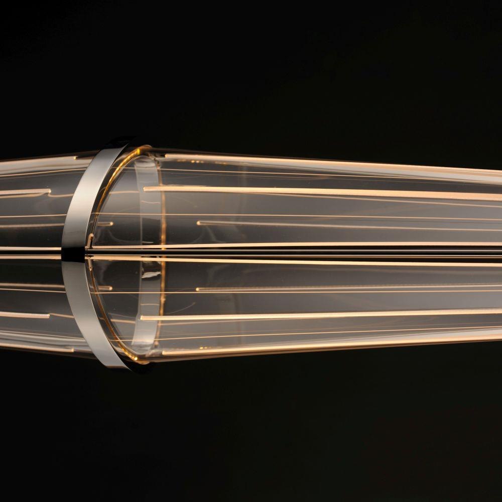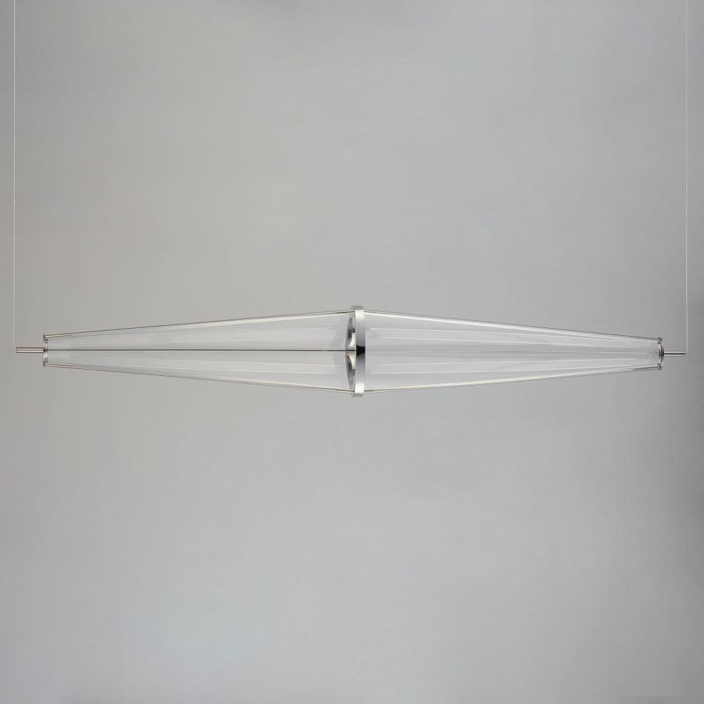 A arrangement of stainless steel and light guided acrylic form elongated rhombus shapes discreetly lit by LED. On the larger size pendants an additional aircraft cable kit is provided so that you can mount the pendants either vertically or horizontally at various angles. Finished in Polished Chrome, these pendants are out of this world.