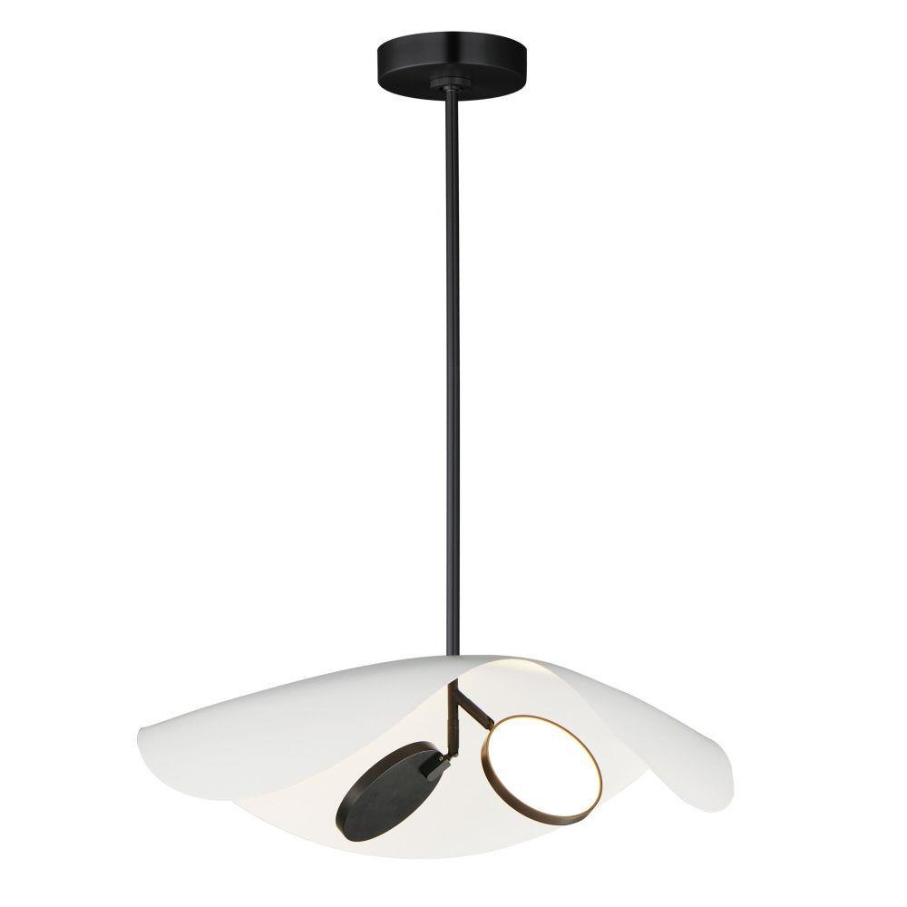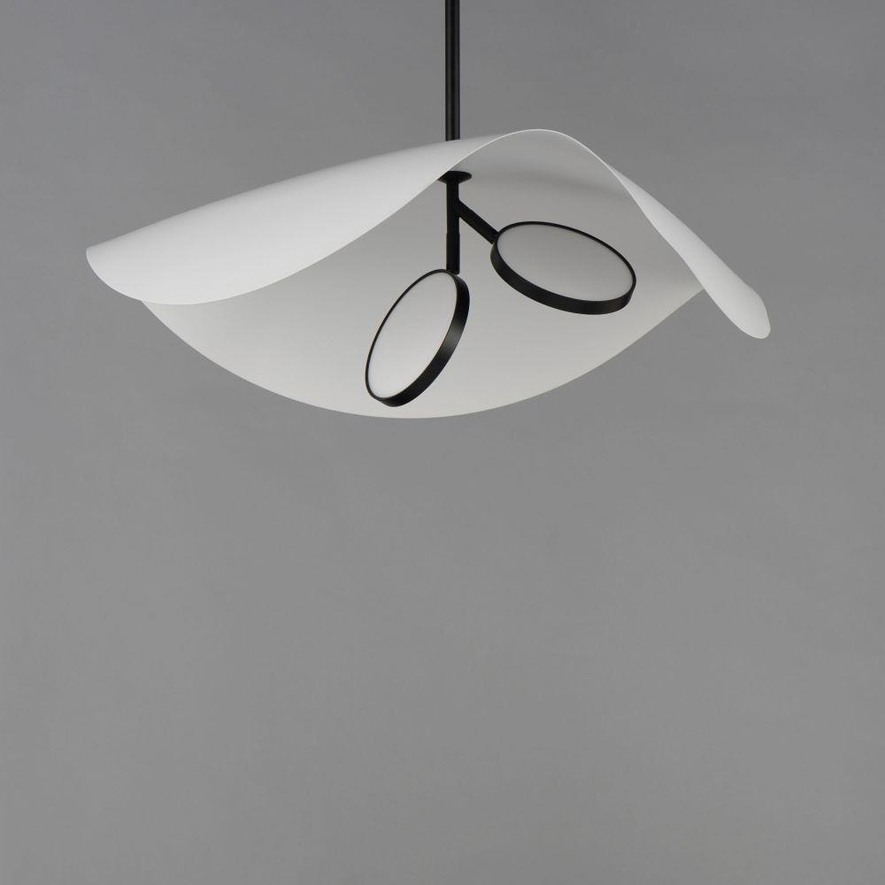 Poetic and organic in design, the undulating form of the metal shade appears to float effortlessly on a slender frame. Abstract discs of LED lighting are encased in round, adjustable heads so that the light can be directed upwards for indirect lighting reflected on the internal white painted face of the shade or the light sources can be rotated downward to provide bright illumination exactly where needed. The simple, sculptural form adds dimension in its scale evocative of a manta ray or the seductive quality of a woman wearing a large floppy hat.