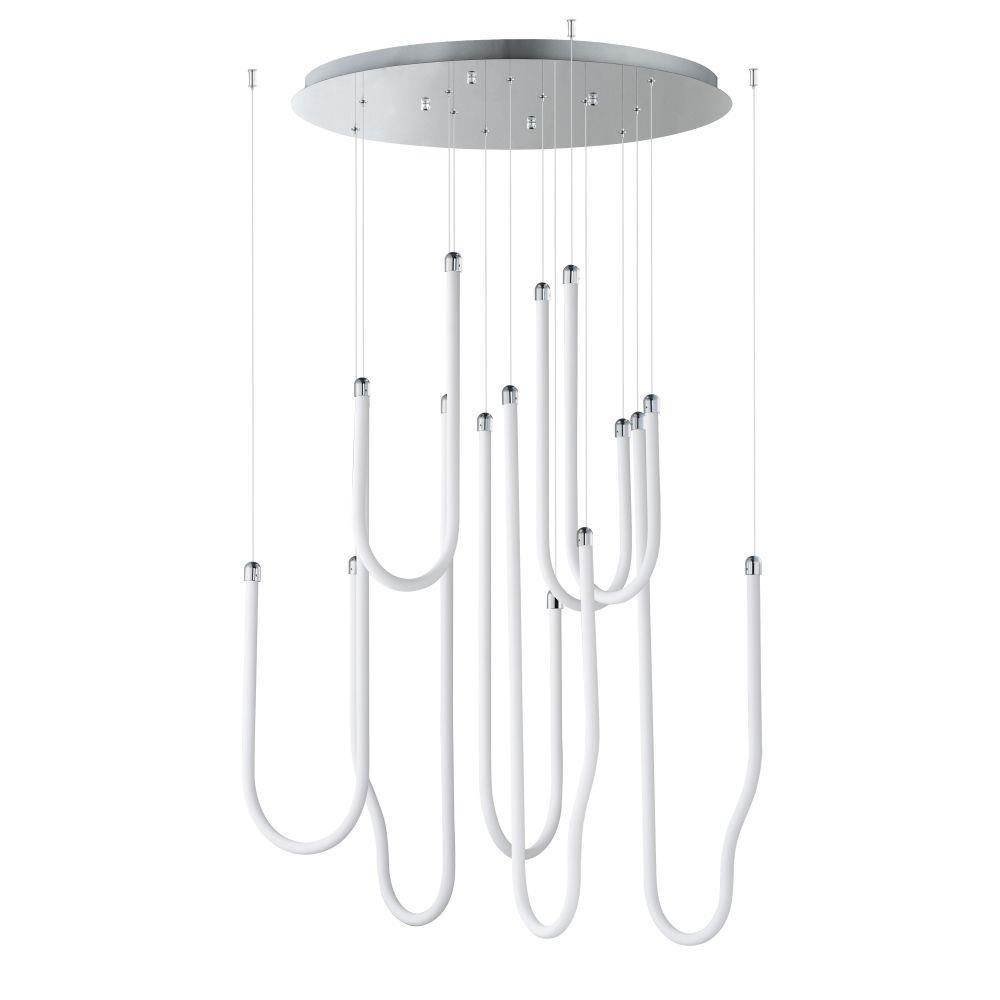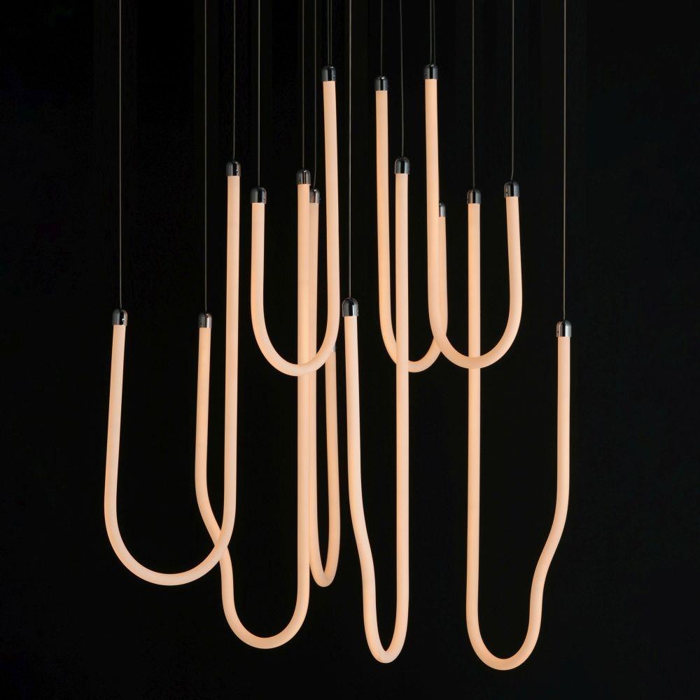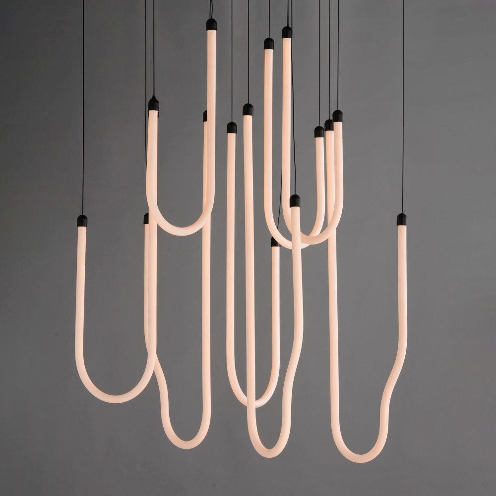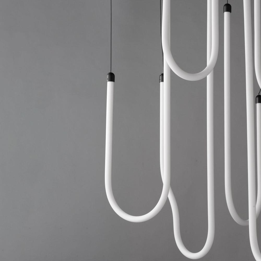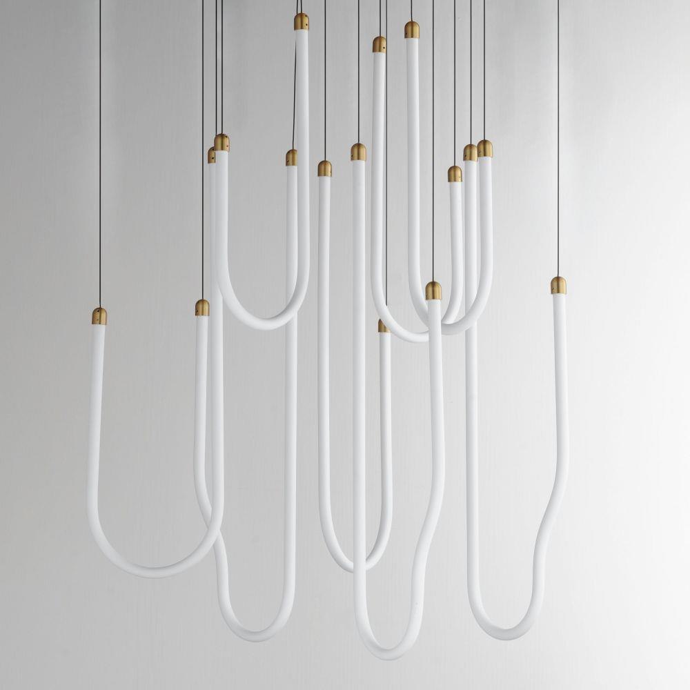 Sweeping matte white acrylic tubes encase an omnidirectional LED light source, arranged in abstract configurations inspired by solar flares. Minimal in composition yet dramatic in form, the Soleil collection offers a striking lighting solution. Available in a range of sizes, including fixed flush mount and field-adjustable pendant configurations, Soleil is offered in Polished Chrome, Matte Black, and Natural Aged Brass, making it a perfect complement to a variety of interior color schemes.
