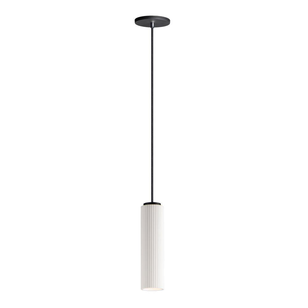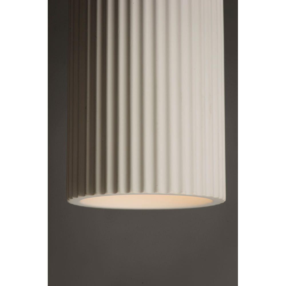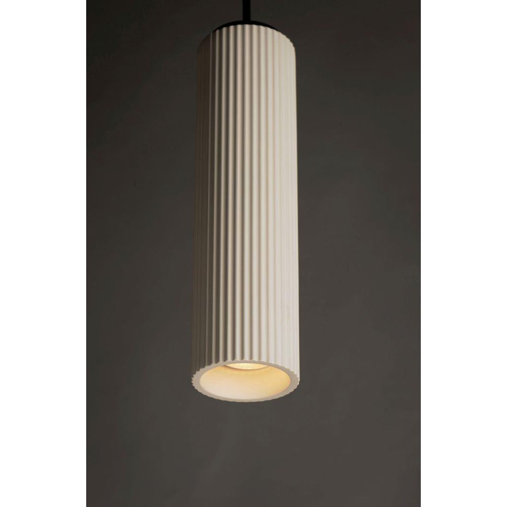 Cylindrical shape pendants cast in White gypsum and accented with Black hardware provide a crisp contemporary design. Both are paintable so you can be creative with the finished look.