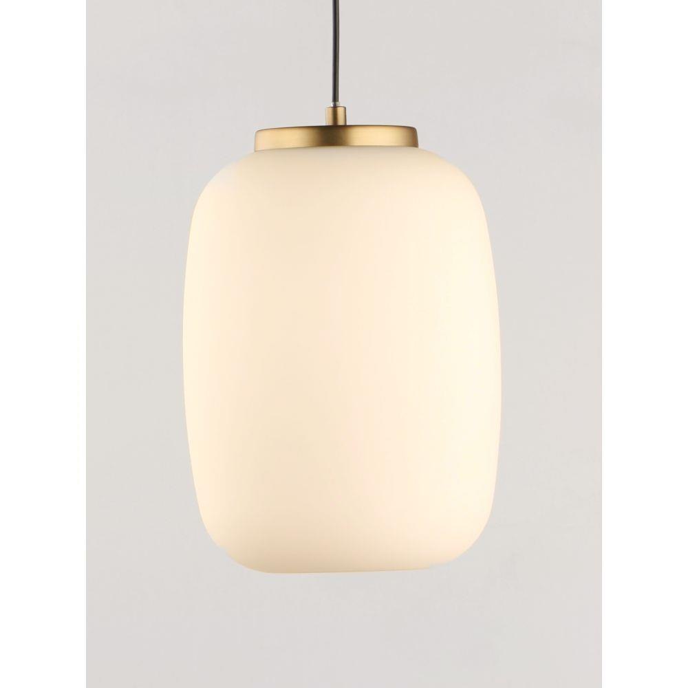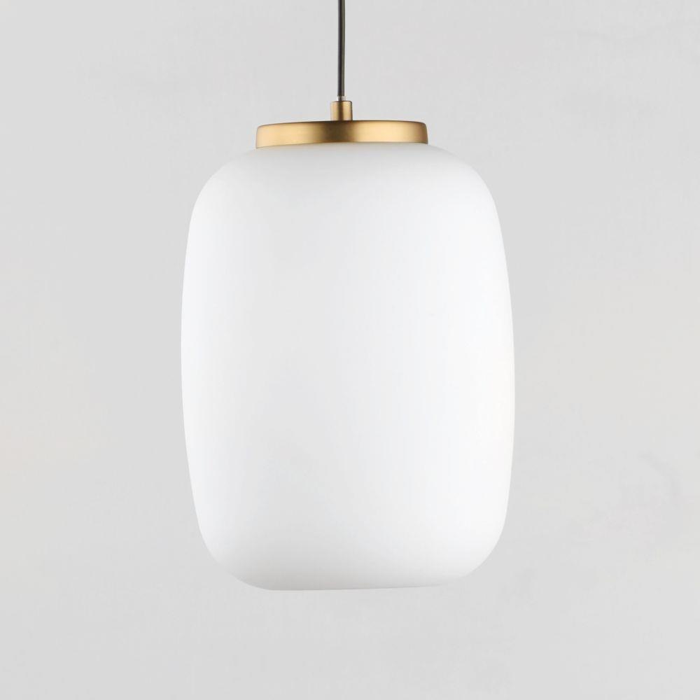 Inspired by Japanese lanterns, this soft contemporary collection features Satin White glass shades of various shapes and sizes mounted on metal frames finished in a dramatic two-tone Gold with Black accents.