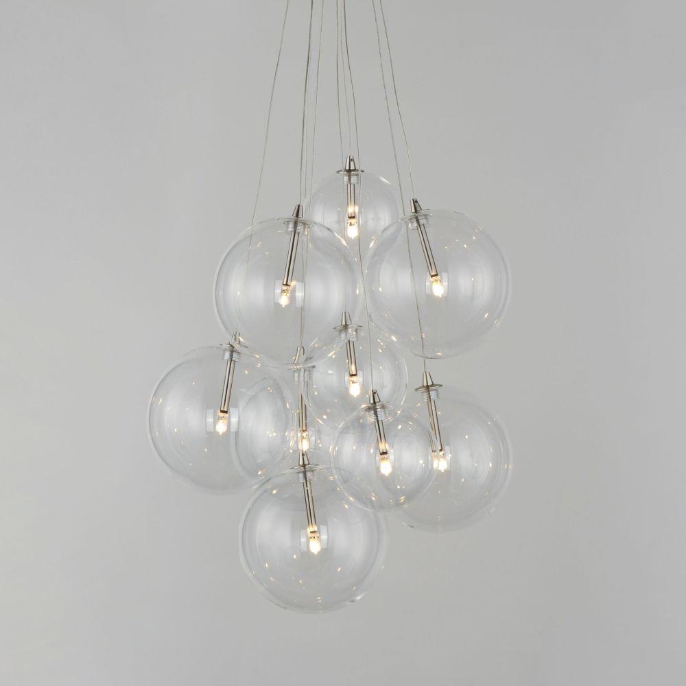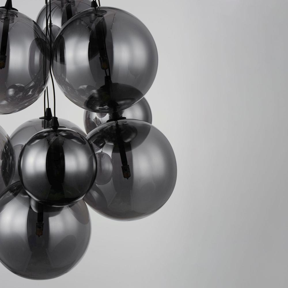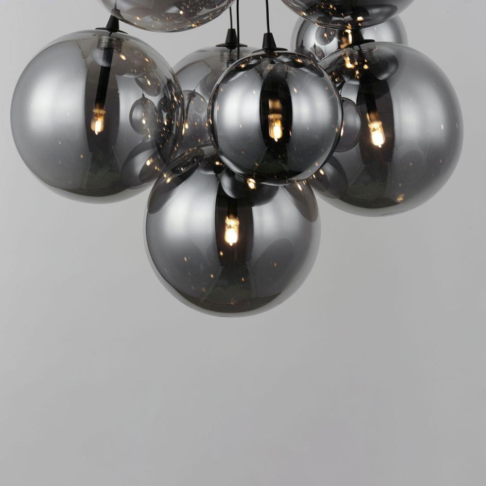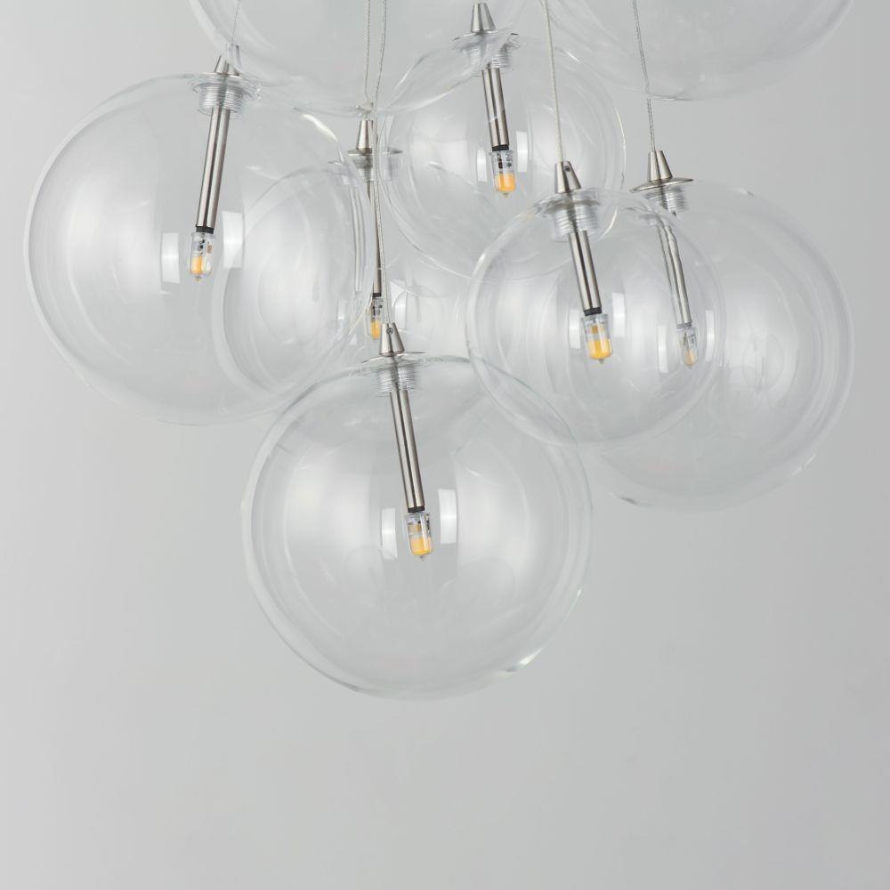 Clusters of glass globes in various sizes and color are suspended from a central point and burst outward. Configurations include a 4-Light, 9-Light, and 12-Light cluster and can be mounted close to the ceiling or included down rods to extend the height. Choose from options of Clear or Frosted glass globe clusters paired with Satin Nickel frames for an airy transitional design or be bold with Mirror Smoked glass or a varied combination of the glass including amber tinted suspended on a Matte Black frame with thin black cables. Small-scaled LED G4 lamps are included with the fixtures and centered in the glass accentuating the scale of the glass.