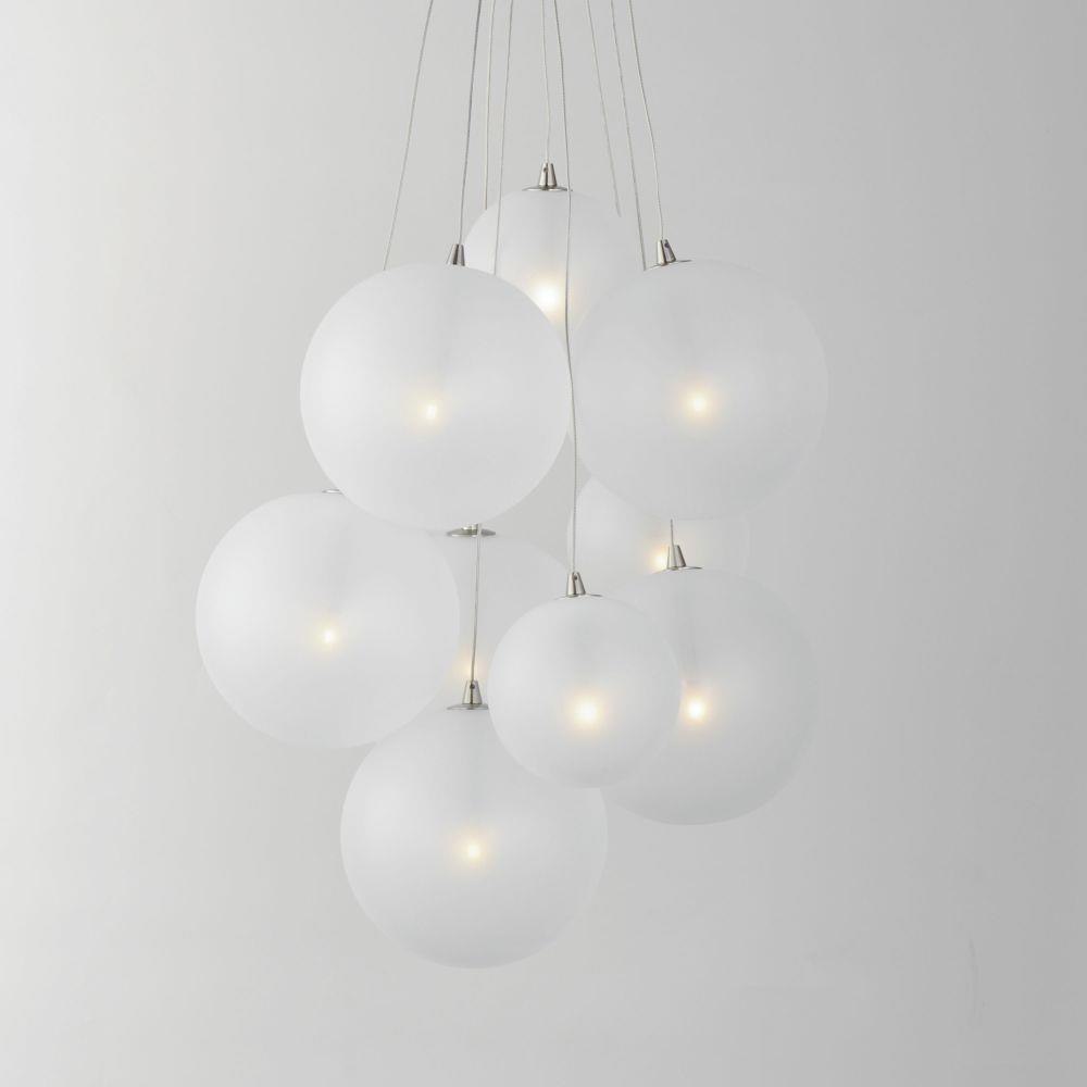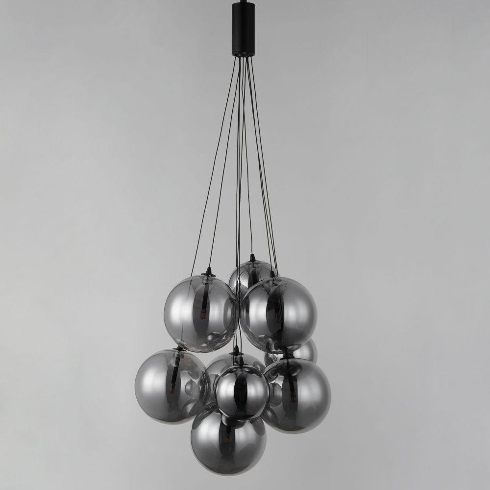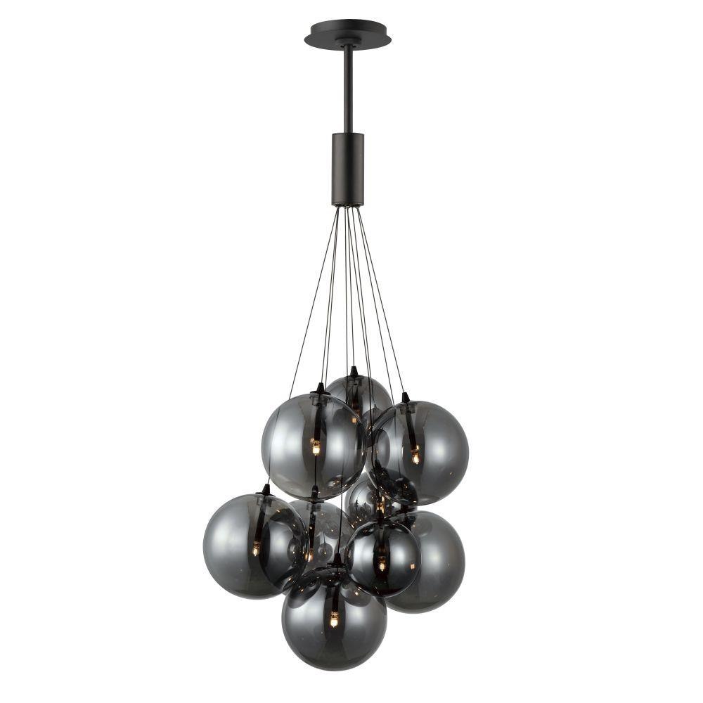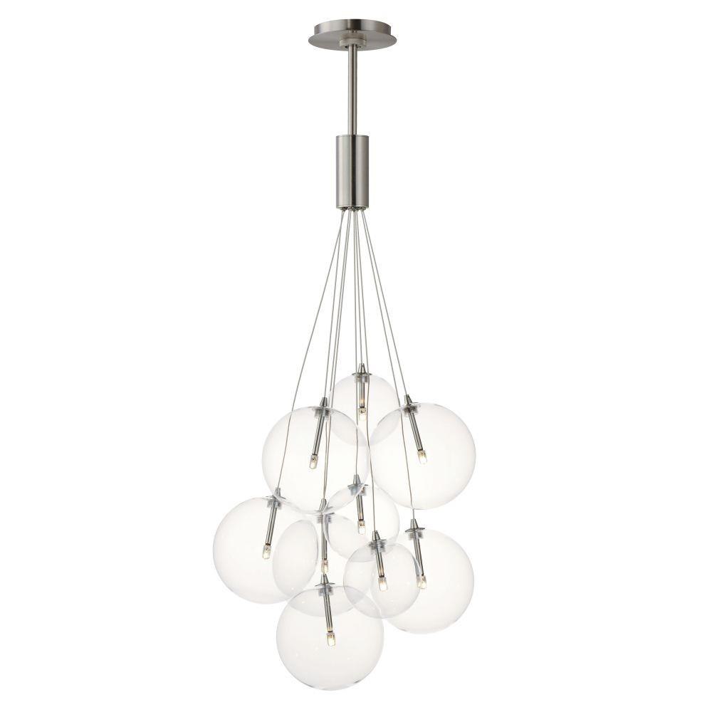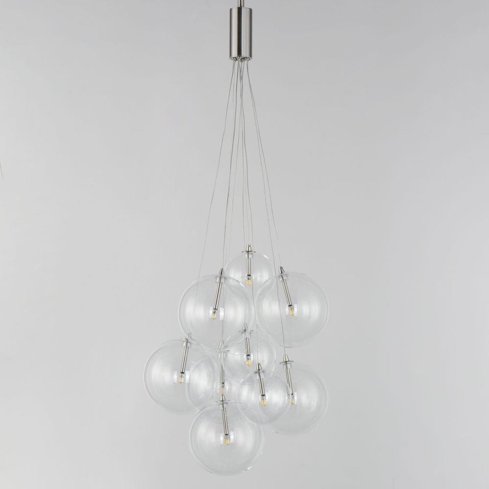 Clusters of glass globes in various sizes and color are suspended from a central point and burst outward. Configurations include a 4-Light, 9-Light, and 12-Light cluster and can be mounted close to the ceiling or included down rods to extend the height. Choose from options of Clear or Frosted glass globe clusters paired with Satin Nickel frames for an airy transitional design or be bold with Mirror Smoked glass or a varied combination of the glass including amber tinted suspended on a Matte Black frame with thin black cables. Small-scaled LED G4 lamps are included with the fixtures and centered in the glass accentuating the scale of the glass.