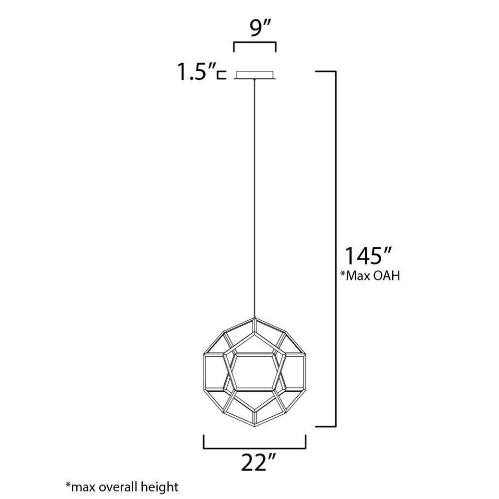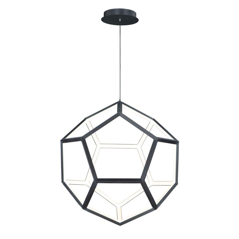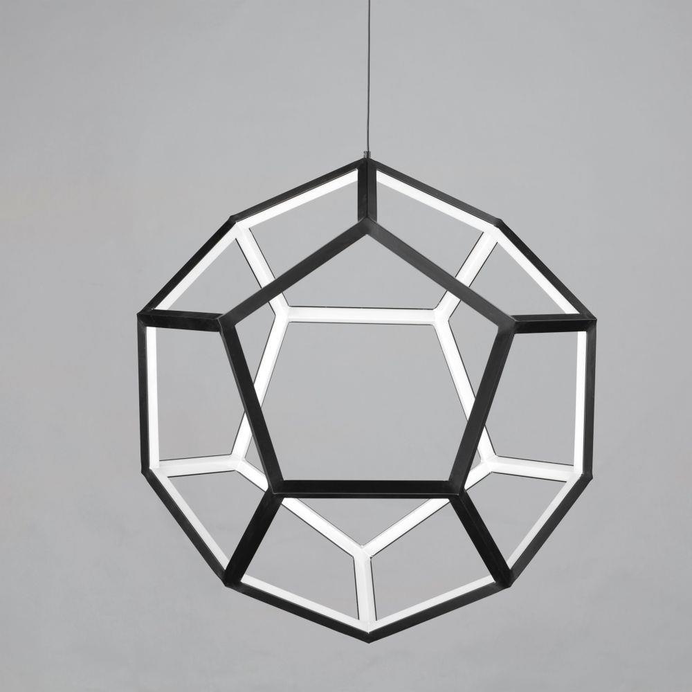 Formed by a series of Black pentagons into a spherical shape, this geometric collection is illuminated from the inside for a dramatic lighting effect. Available in 3 sizes ranging from 22 Inch to the dramatic 40 Inch large pendant.