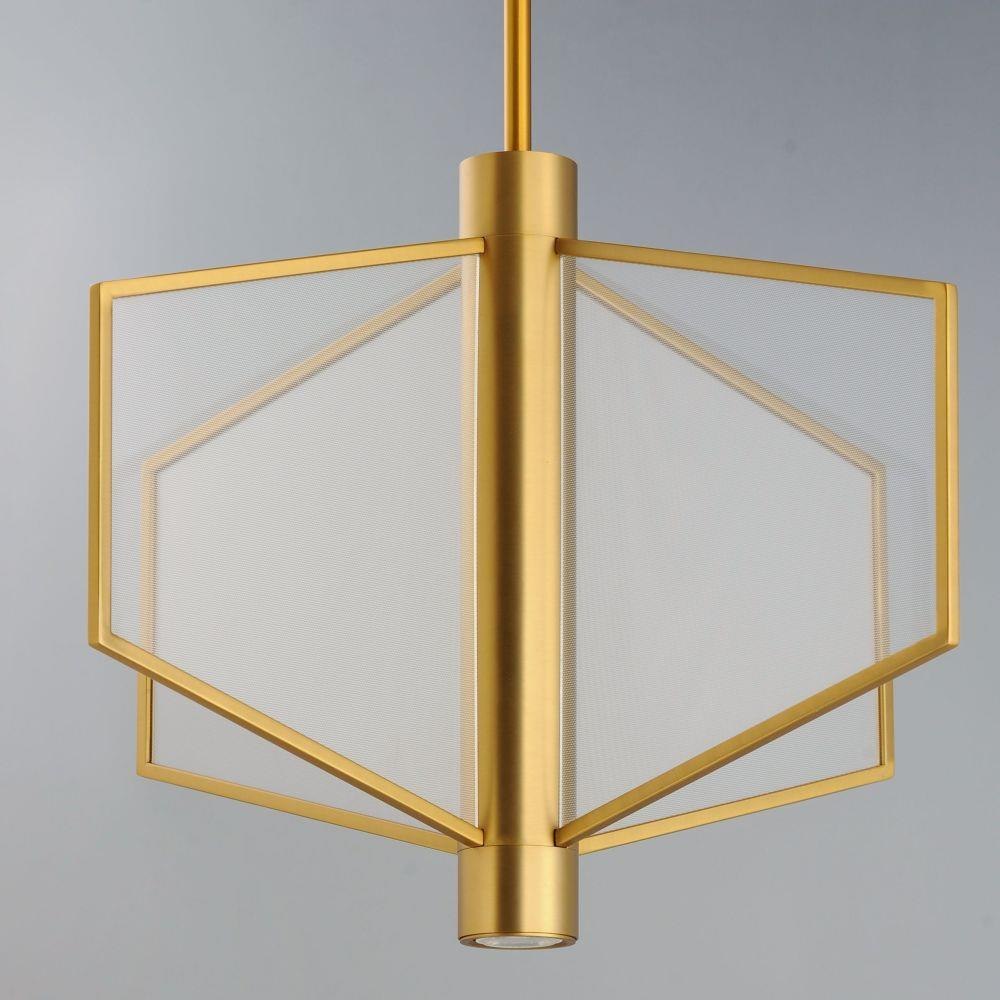 Translucent acrylic panels dotted to guide indirect LED strips integrated into the body of the fixture. The angular forms of the pendants create a strikingly modern display of light that is both airy and voluminous. An additional LED GU10 bulb is recessed at the bottom of the fixture for additional functional light. Available in Satin Brass or Matte Black finishes.