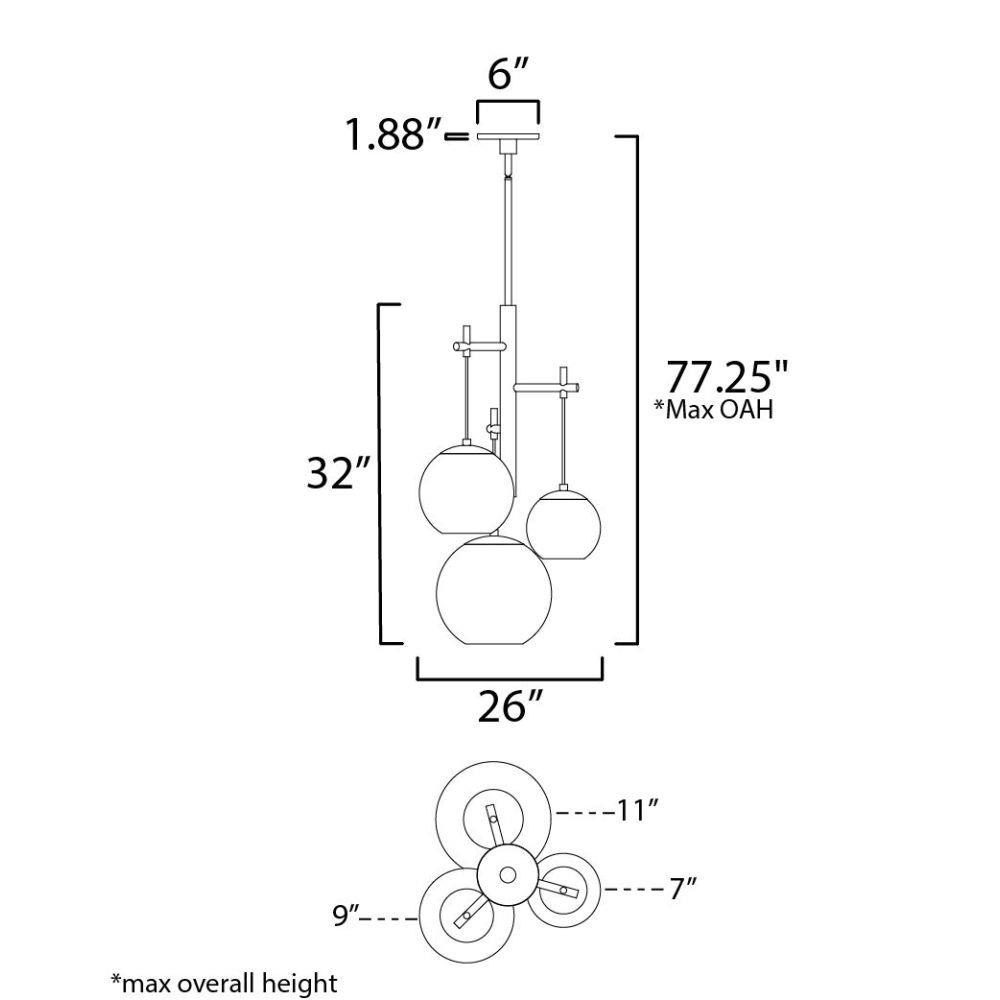 Three sizes of thick Clear glass orbs are suspended displaying a small aluminum sphere encompassed within. Discretely recessed dedicated LED provides ample lighting without glare. Branching out from a central structural column, the striking Black and Satin Brass combination an additional LED light source directs light downward. These atomically inspired fixtures are sure to make a statement.