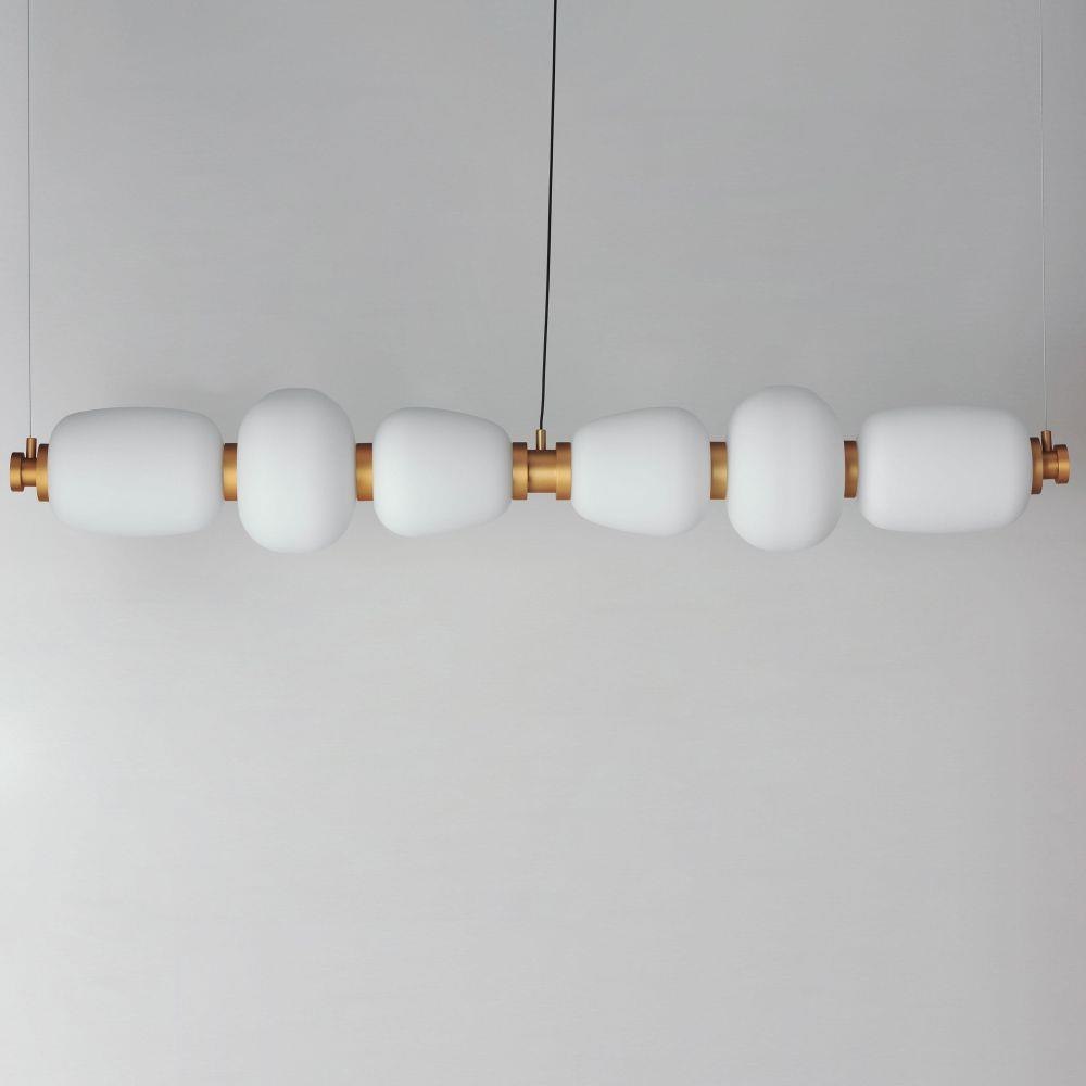 Inspired by Japanese lanterns, this soft contemporary collection features Satin White glass shades of various shapes and sizes mounted on metal frames finished in a dramatic two-tone Gold with Black accents.