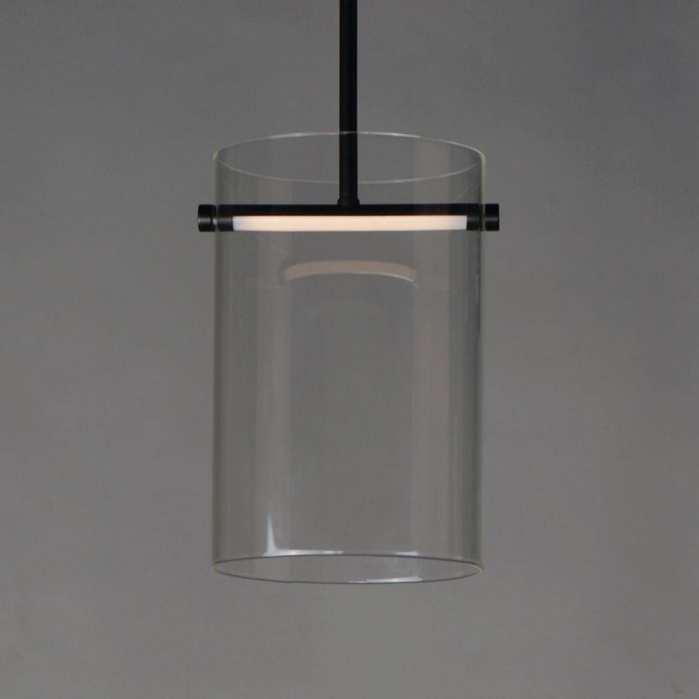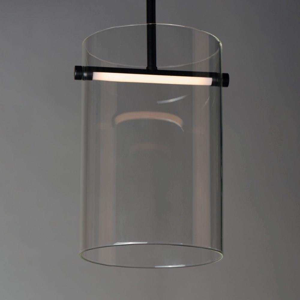 Modern, Clear glass cylinders suspended by streamlined pole structures that brightly illuminate surfaces below with high powered integrated LED. Select from two finishes, Black or Gold, and two sizes of pendants, 9 or 12.5 inch diameters, as well as a coordinating wall sconce.