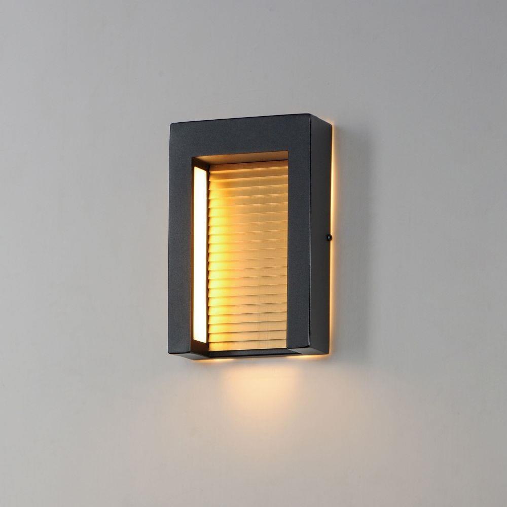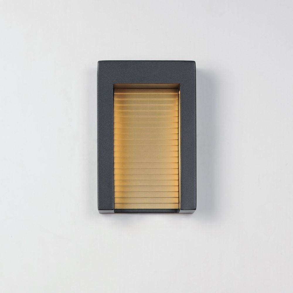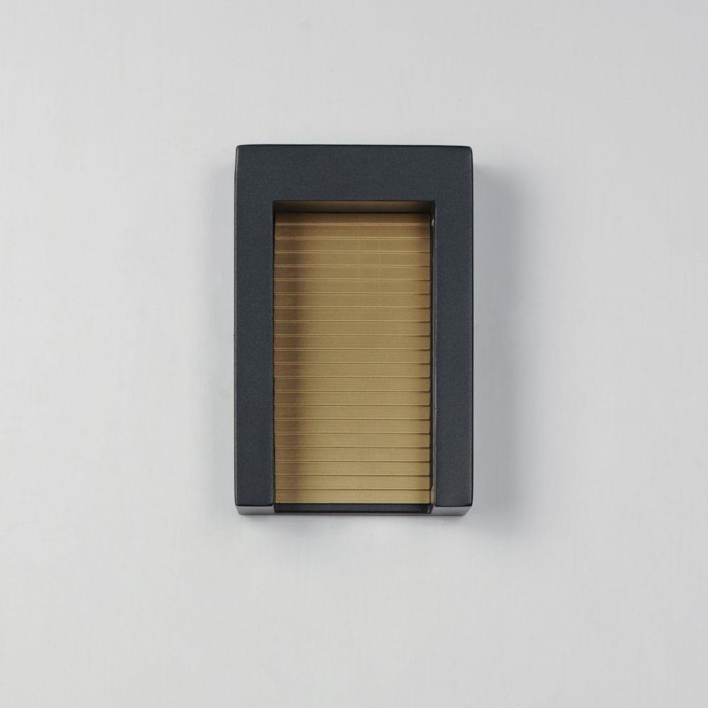 Die cast aluminum frames house a niche of stainless steel corrugated panels in a Gold finish. Two strips of dedicated LED lighting illuminate the washboard shape, which produces a warmer ambient light source when reflected off the contrasting Gold tone.