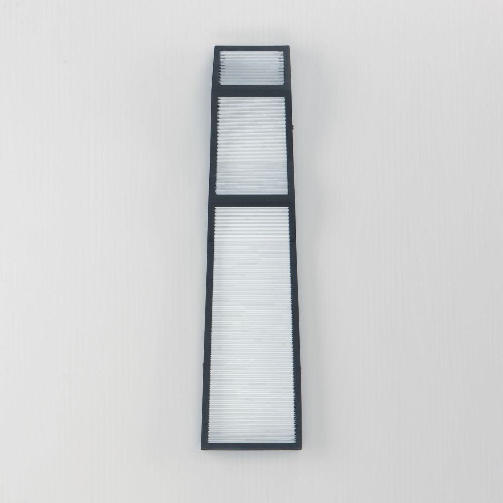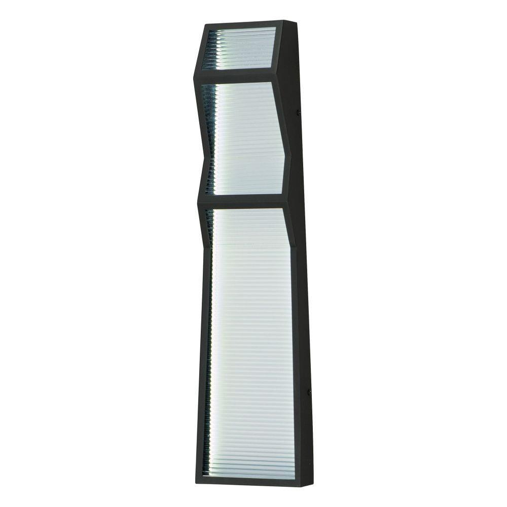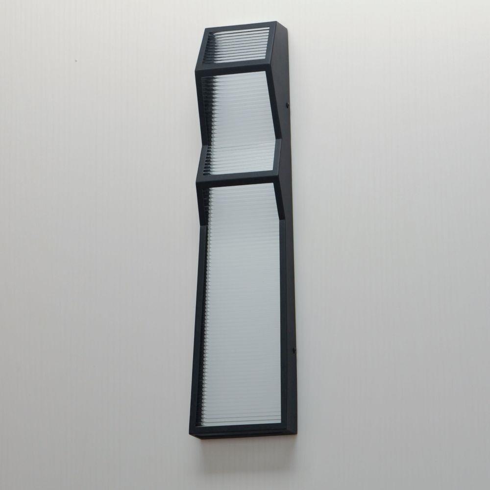 Zigzag towers of ribbed glass and a textured black frame. The ribbed glass texture is back lit by integrated LED strips housed within that shine bright illumination against a white reflective backdrop. With a 3" extension, these wall sconces add visual interest to your interior or exterior space, and meet ADA requirements for use down corridors and other public spaces.