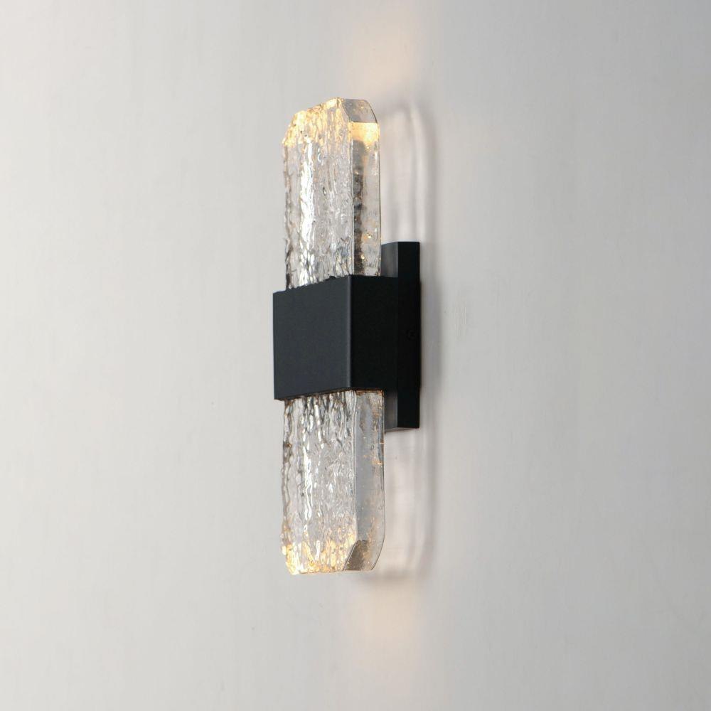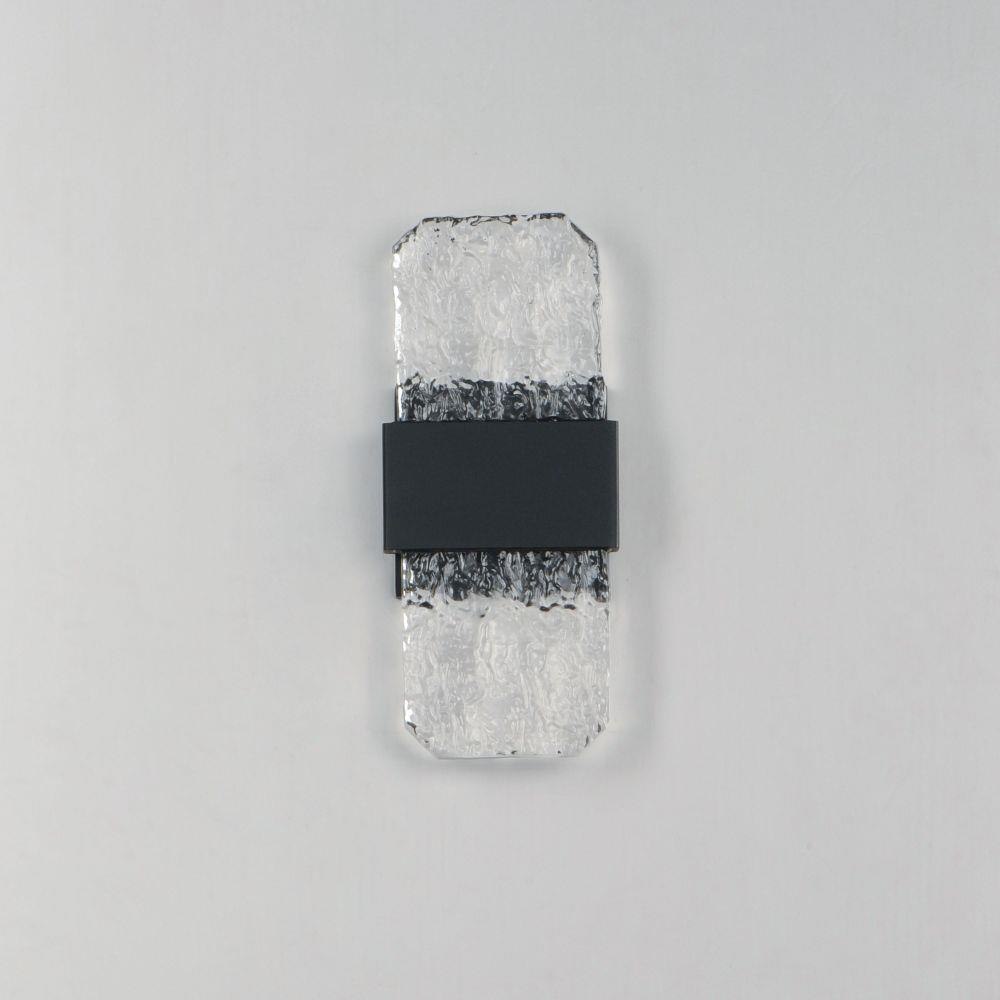 Artisanal cast glass slabs are supported by a Die Cast Aluminum bracket finished in an outdoor rated Black powder coat. Emphasizing the unique beauty of the glasses' imperfect contours, the sconces accentuate these features with concealed LED lighting. Available in 3 size configurations, the sconces provide adequate lighting and showcase the craftsmanship of the artistic glass.