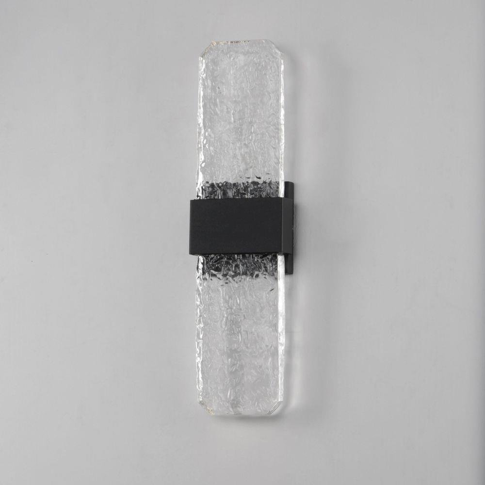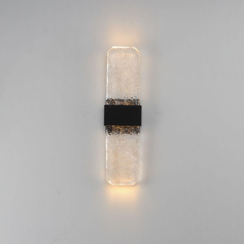 Artisanal cast glass slabs are supported by a Die Cast Aluminum bracket finished in an outdoor rated Black powder coat. Emphasizing the unique beauty of the glasses' imperfect contours, the sconces accentuate these features with concealed LED lighting. Available in 3 size configurations, the sconces provide adequate lighting and showcase the craftsmanship of the artistic glass.