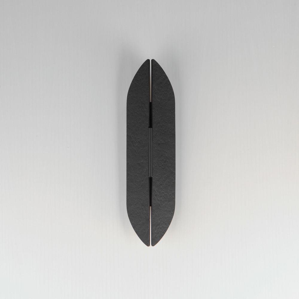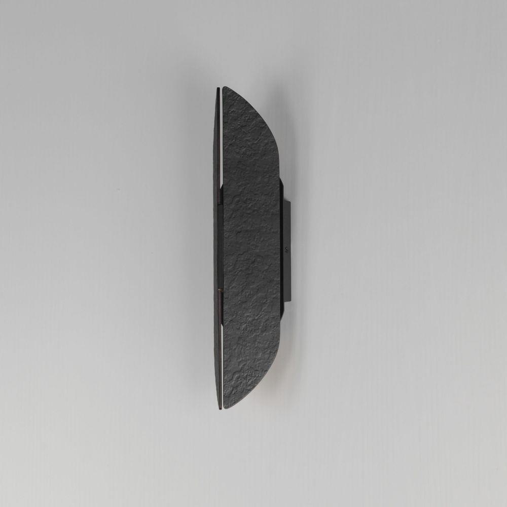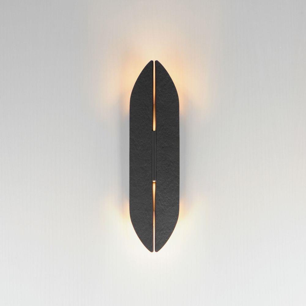 An enigmatic light source projects from the wall, obscured by two panels with an organic textural relief and split down the center to cast soft ambient light. Open at the top and bottom as well, the light shines both upwards and downwards and signals the source of its illumination through the crevice that it creeps out from. Finished in Matte Black externally, the interior of the sconces are powder coated antique brass to add warmth to the rustic glow. Available in 3 sizes, this ADA compliant sconce series adds mystique to the spaces it's installed.