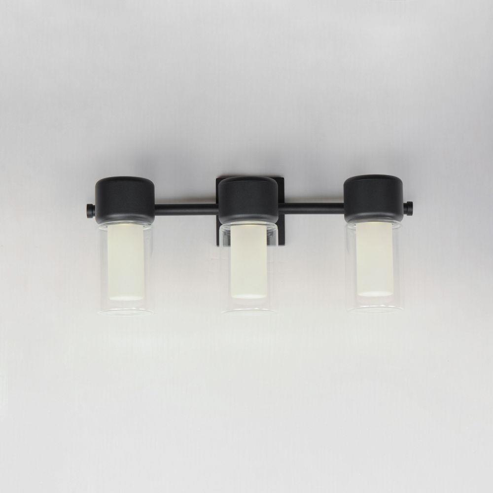 Dual Cylinder glass shades diffuse LED light bulbs concealed within rounded caps in Black powder coat. The single sconce is wet located with intention to be used outdoors, while the complementary 3-Light wall sconce is perfect for use in transitional to more modern bathrooms. The LED lamp provided is T24 JA8 compliant and Energy Star listed.