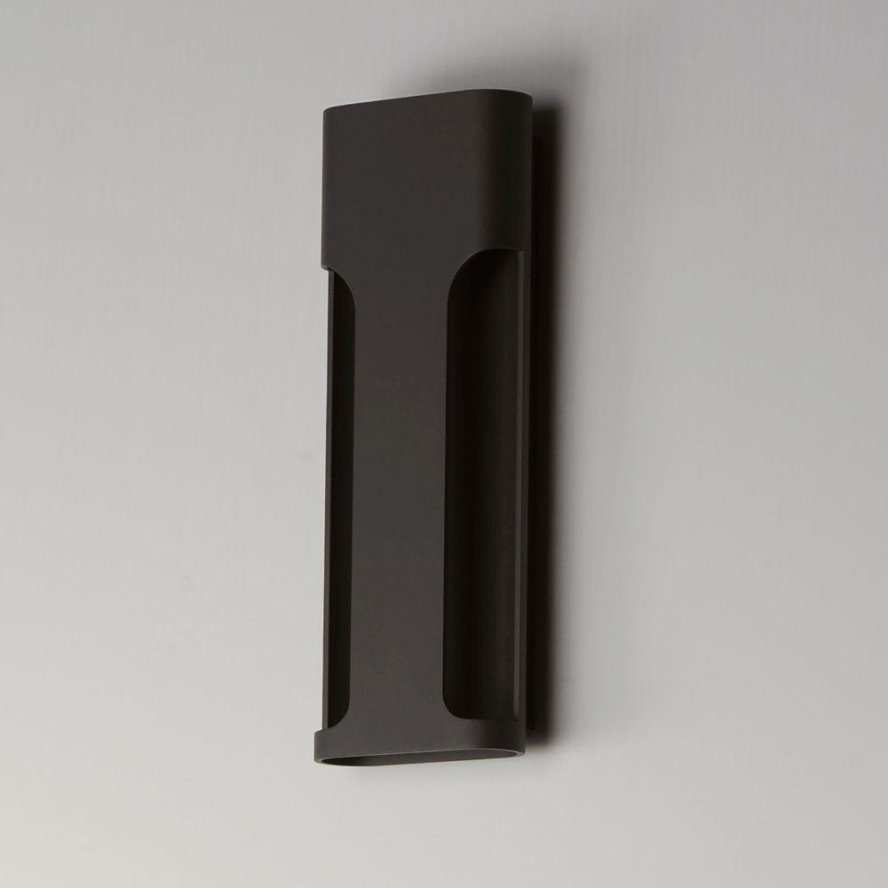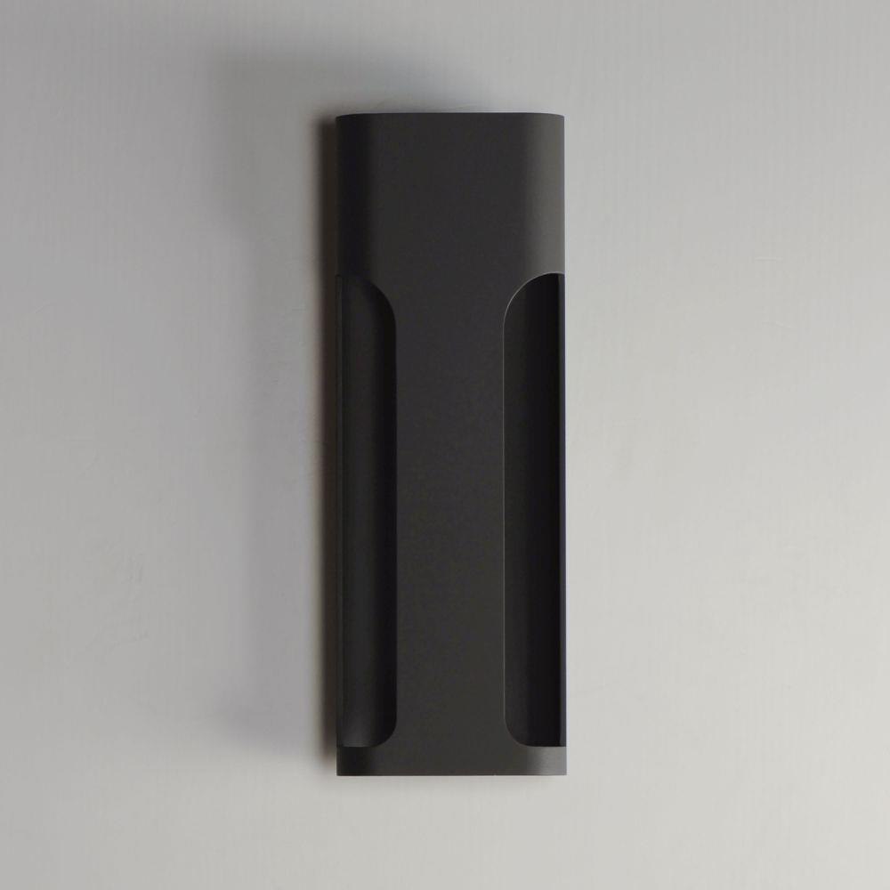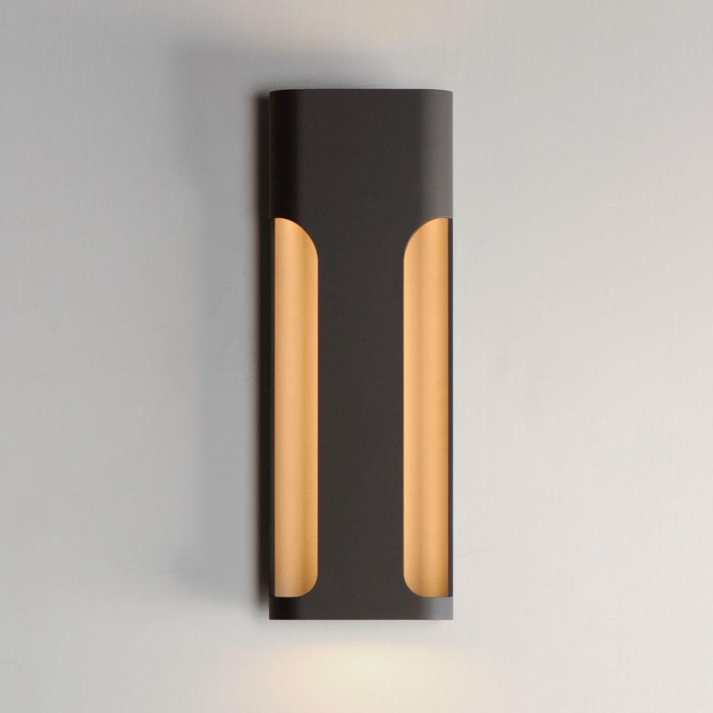 Large aluminum extrusions with indirect lighting highlights cut outs in this architectural outlook. Directed outwards toward the cutouts, these sconces are rated for outdoor applications. Select from Black or Architectural Bronze finishes and two sizes of sconce, one of which is scaled for larger façade applications.
