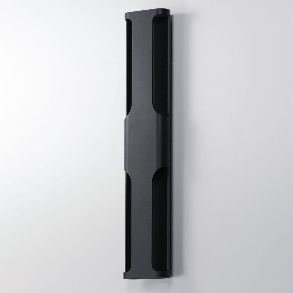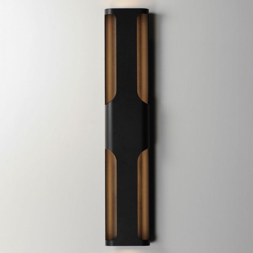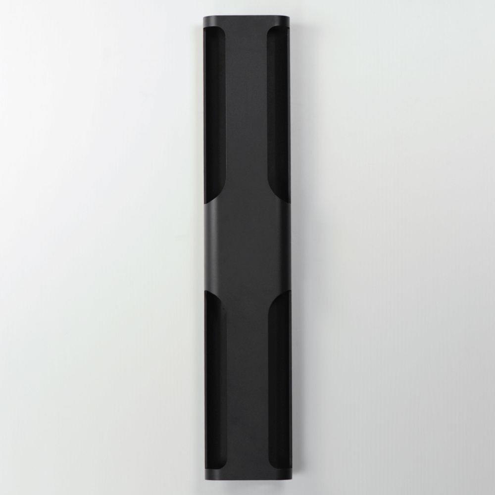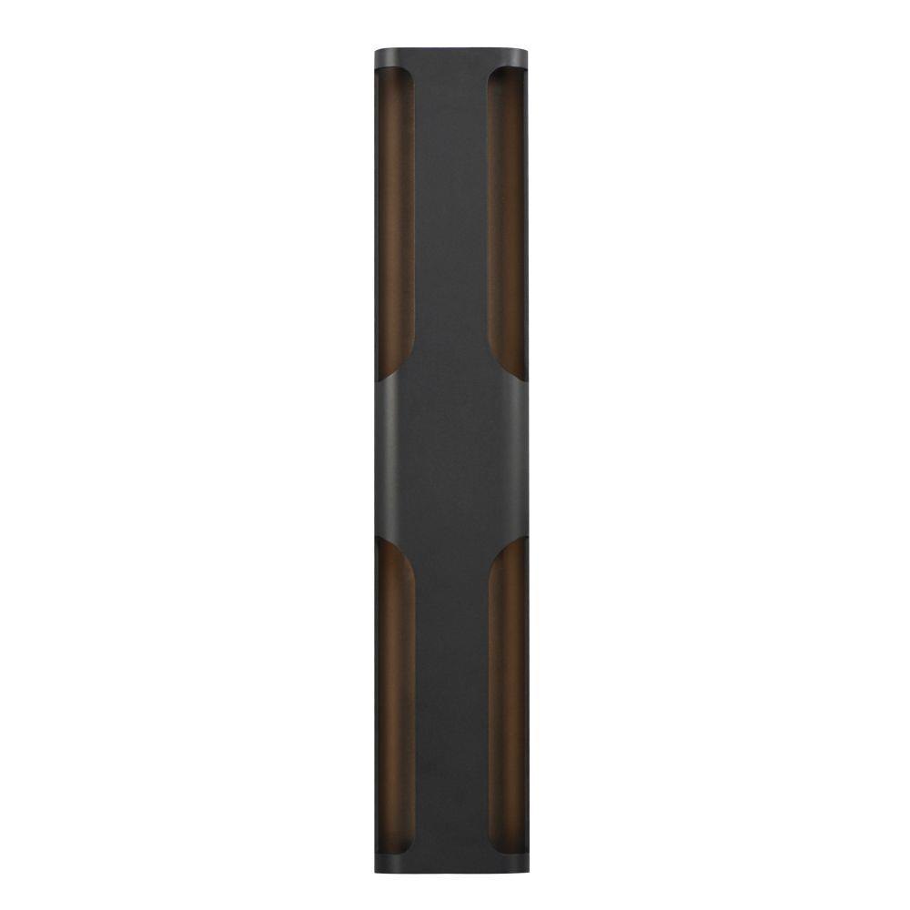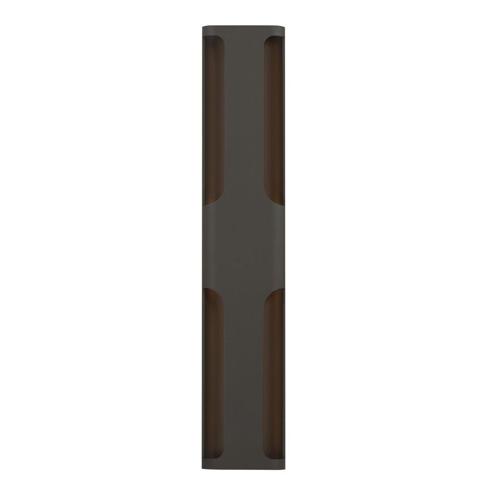 Large aluminum extrusions with indirect lighting highlights cut outs in this architectural outlook. Directed outwards toward the cutouts, these sconces are rated for outdoor applications. Select from Black or Architectural Bronze finishes and two sizes of sconce, one of which is scaled for larger façade applications.