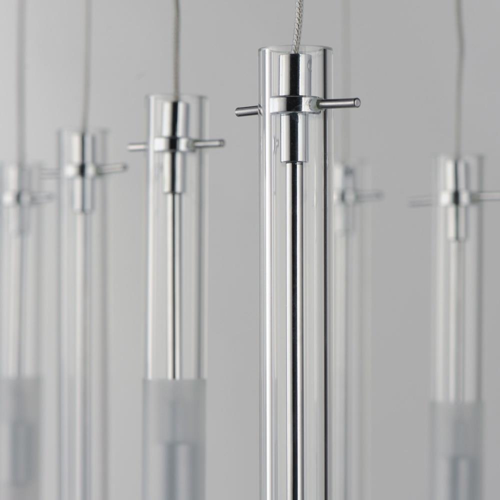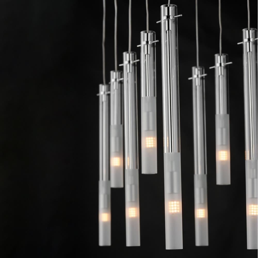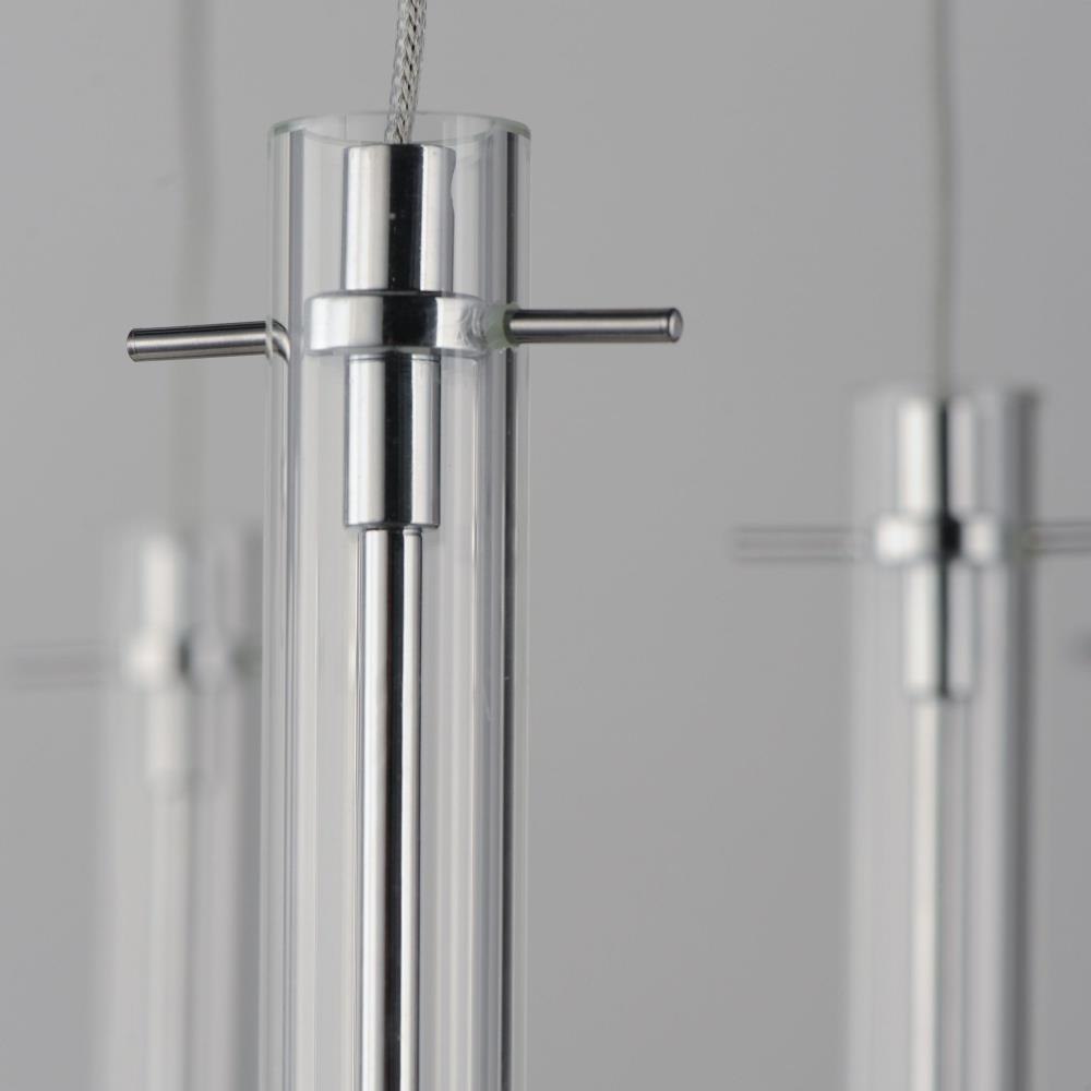 Slender Clear glass tubes sheath a Polished Chrome rod that supports small LED lamps. The glass is etched at a dividing line in the glass to softly diffuse the light. Available in two lengths of glass tube, the pendants are also available in multiple configurations that create a modern candle-like cluster. The surface mounted option supports the glass on a structure that allows it to hang freely for dual purpose as a ceiling flush mount or a hanging glass shade when mounted to a wall. JA8 Listed LED G9 lamps are provided for efficient lighting and reduced energy consumption.