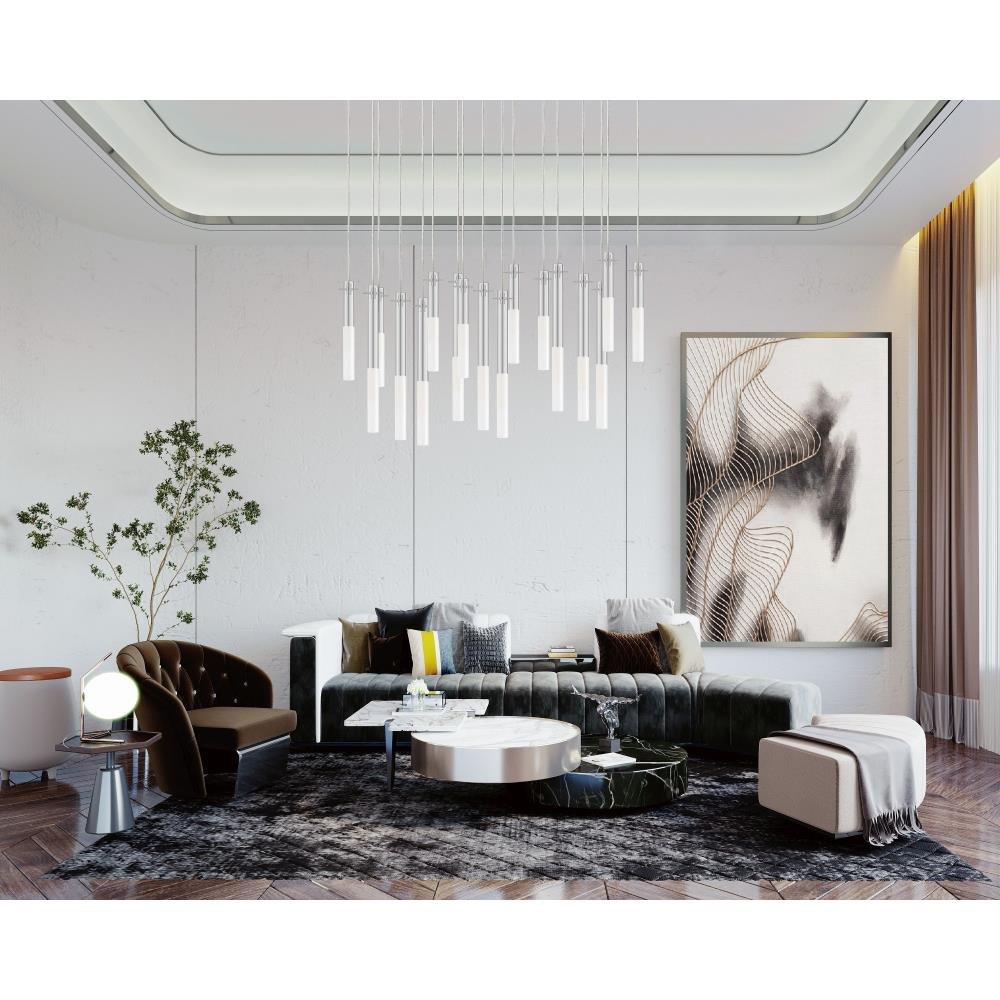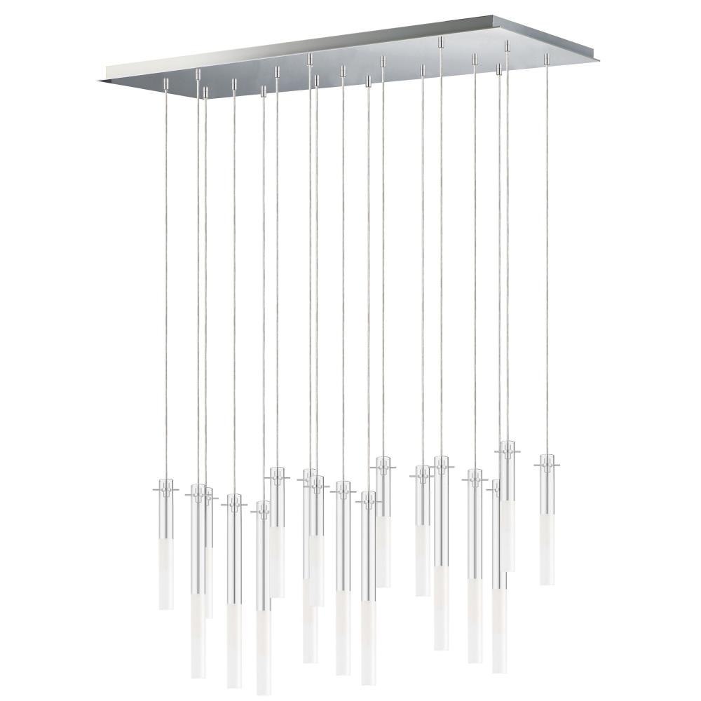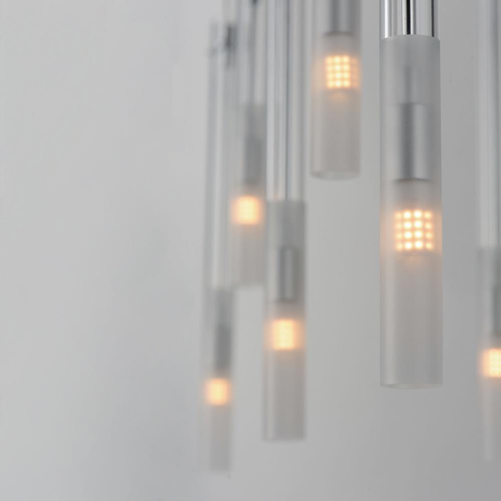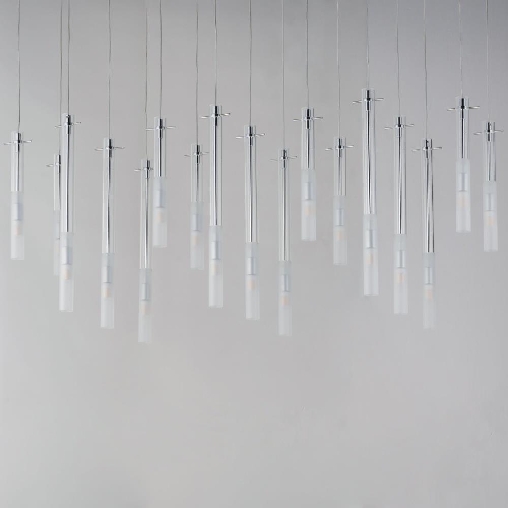 Slender Clear glass tubes sheath a Polished Chrome rod that supports small LED lamps. The glass is etched at a dividing line in the glass to softly diffuse the light. Available in two lengths of glass tube, the pendants are also available in multiple configurations that create a modern candle-like cluster. The surface mounted option supports the glass on a structure that allows it to hang freely for dual purpose as a ceiling flush mount or a hanging glass shade when mounted to a wall. JA8 Listed LED G9 lamps are provided for efficient lighting and reduced energy consumption.