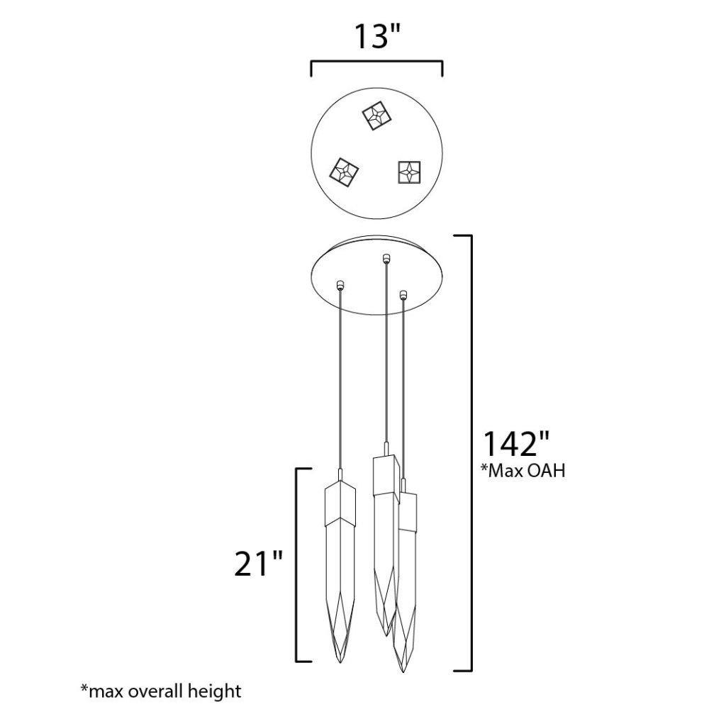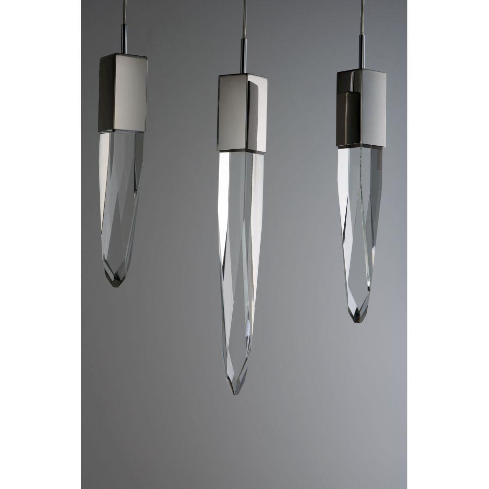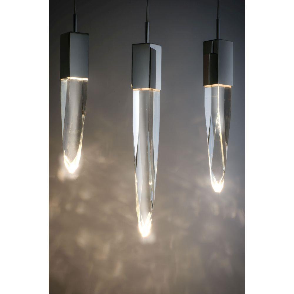 Stalactites of Clear Beveled crystal suspend from your choice of Polished Chrome or Black supports, can be hung at various heights to create a spectacular array. The crystal shimmers as light diffuses through the facets powered by 90 CRI LED dimmable modules.