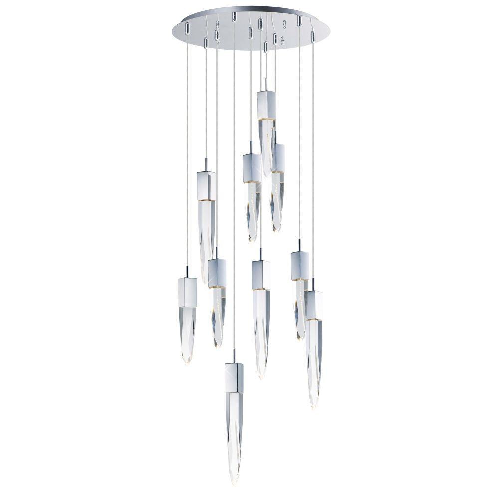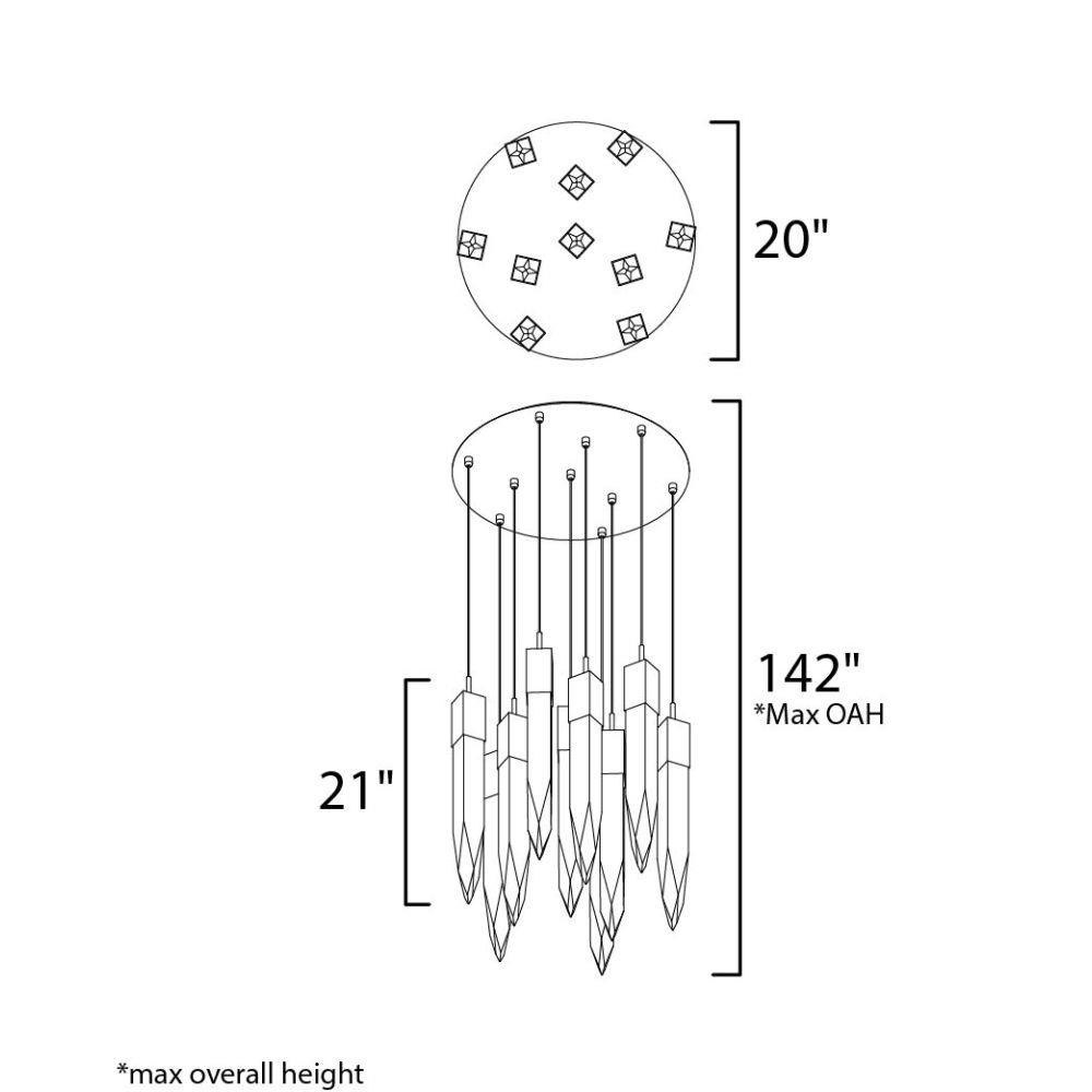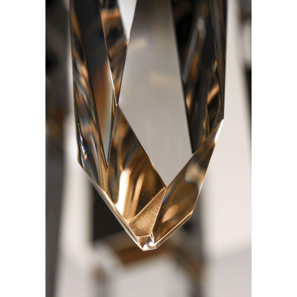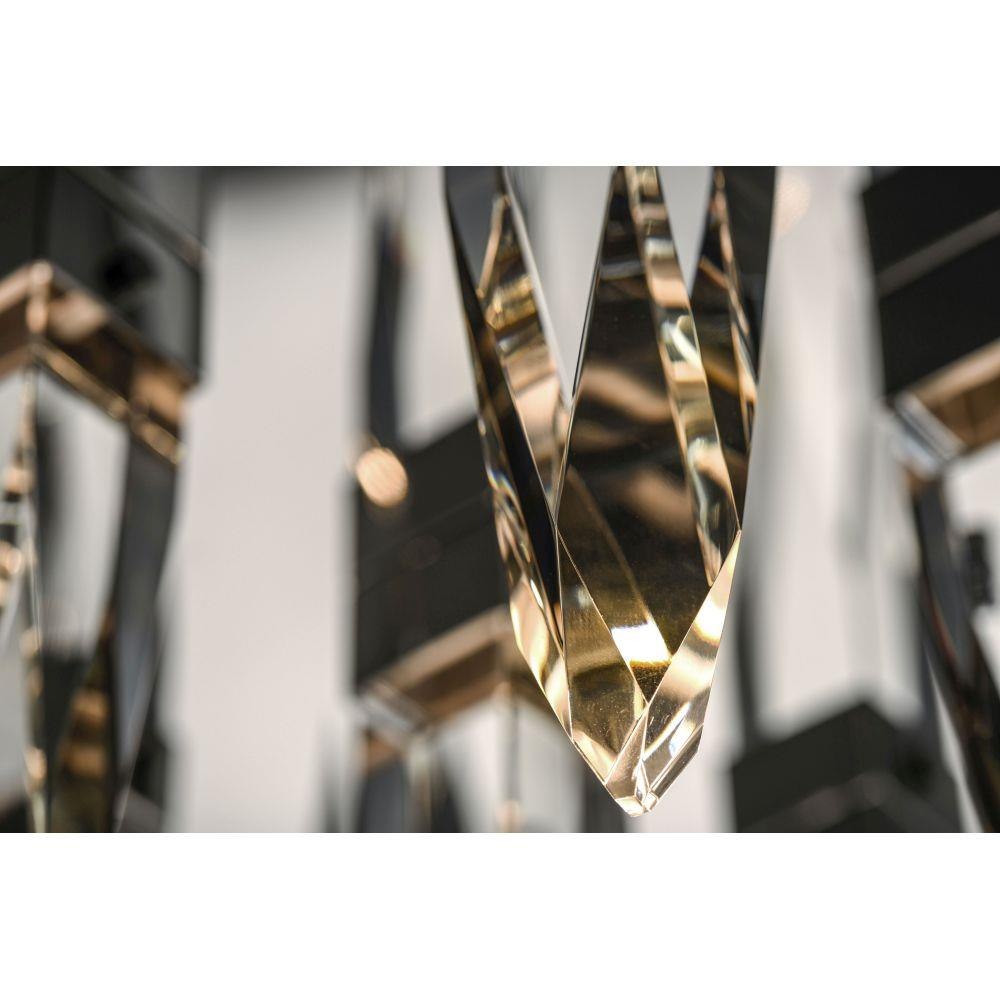 Stalactites of Clear Beveled crystal suspend from your choice of Polished Chrome or Black supports, can be hung at various heights to create a spectacular array. The crystal shimmers as light diffuses through the facets powered by 90 CRI LED dimmable modules.