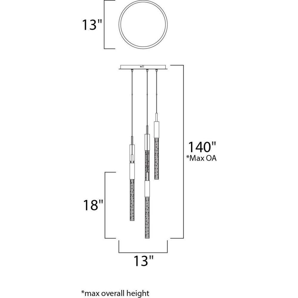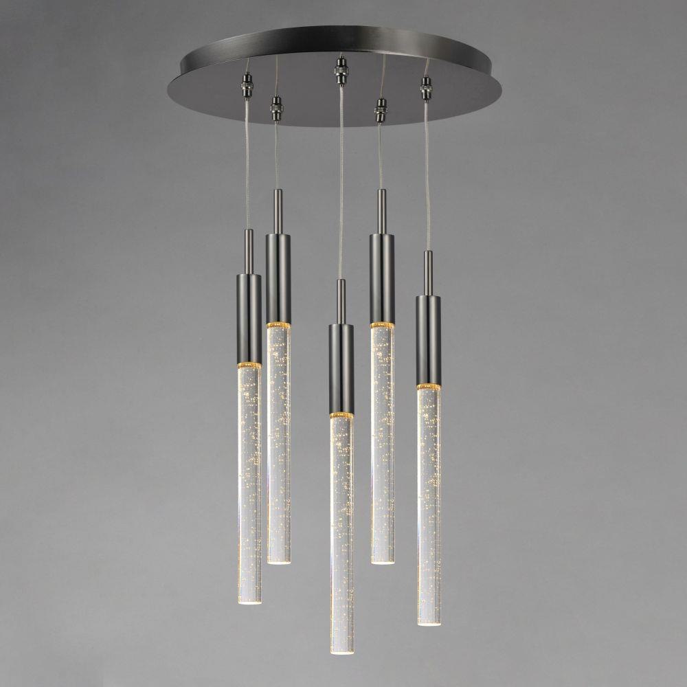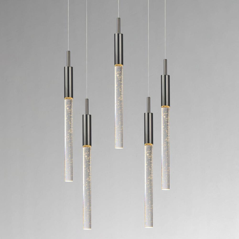 Slender beveled cut rods of bubble glass, illuminated by high power LED modules, suspend in an array of fashionable configurations. Available in Black Chrome with Clear bubble glass and Anodized Bronze with Champagne bubble glass.