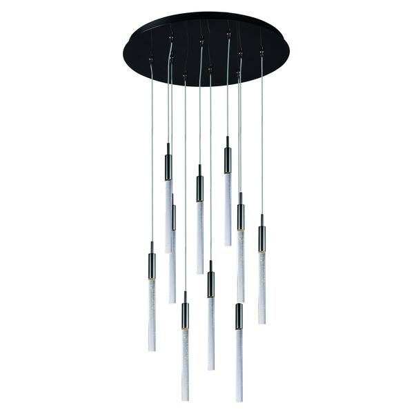 The Scepter pendant light features 10 slender bevel cut rods of bubble glass, illuminated by high power LED modules. The contemporary black chrome base and clear bubble glass will look elegant in your modern entryway. The suspended lights can be configured in a number of different lengths.