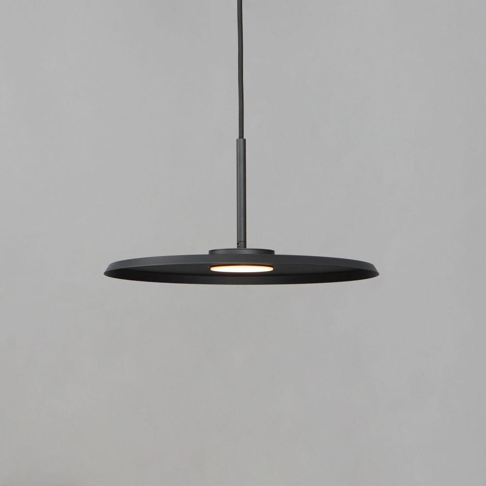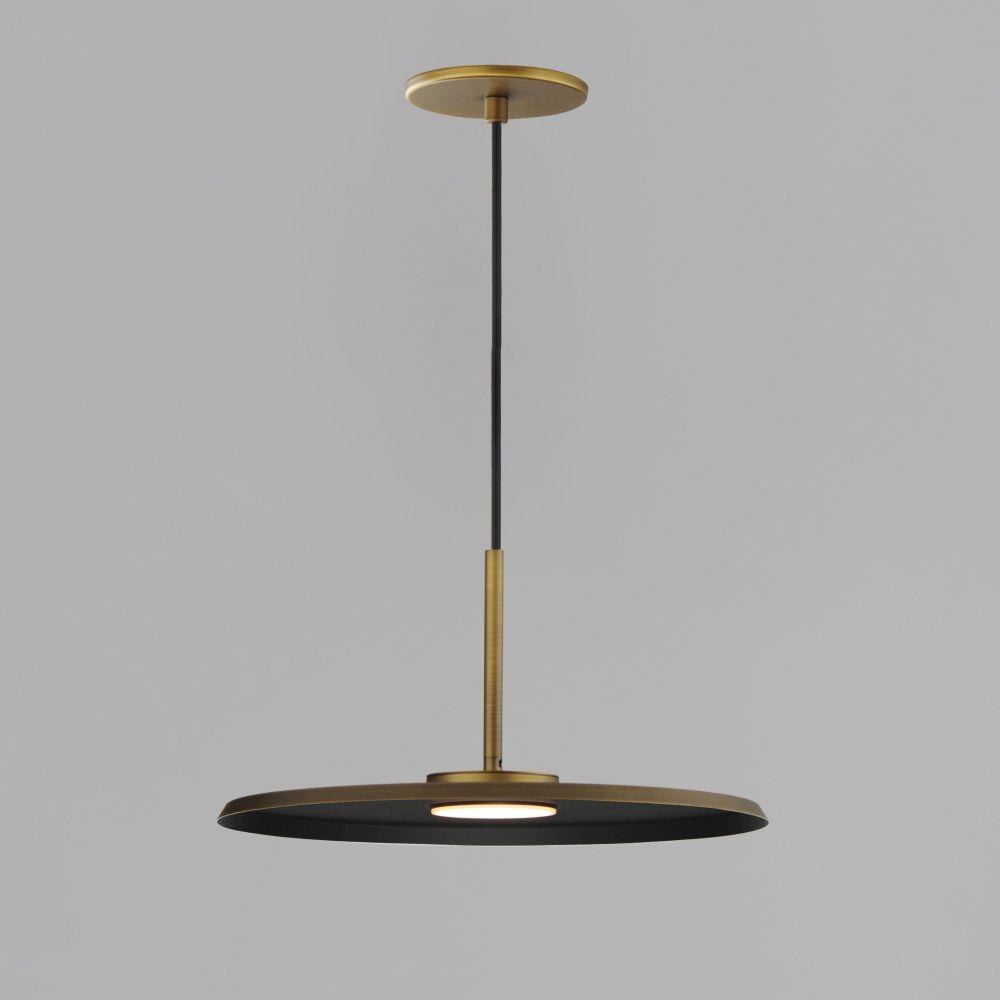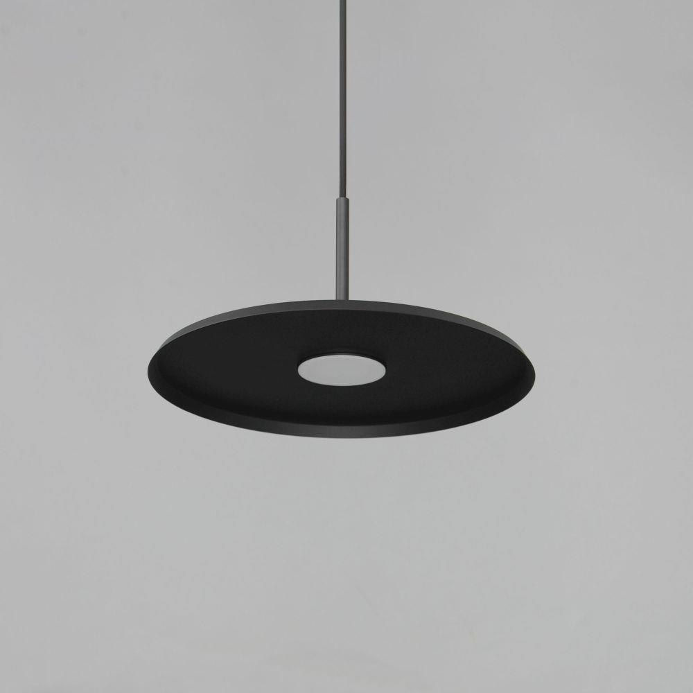 Wide flat discs house LED engines that disappear when viewed at the pendants edge. Supported at their center by thin tubes and black cable, machined aluminum housings feature laterally cut concentric circles drawing inspiration from the grooves in a vinyl record. Finished in your choice of Matte Black, Antique Brass, or Antique Copper, the modern design feels vintage and retro widening the range of compatibility within architectural aesthetics.