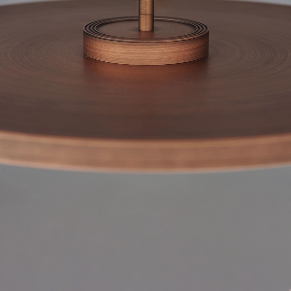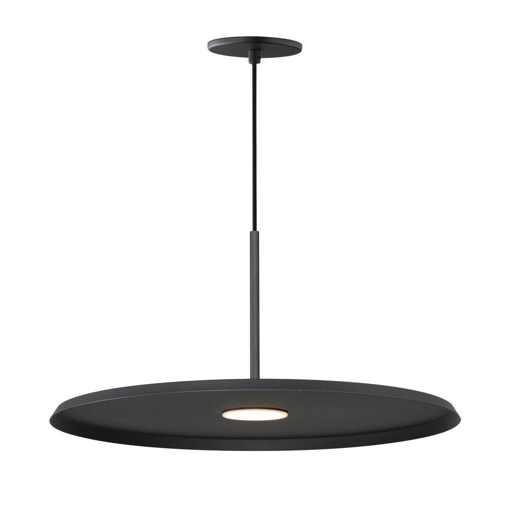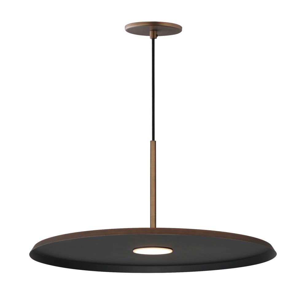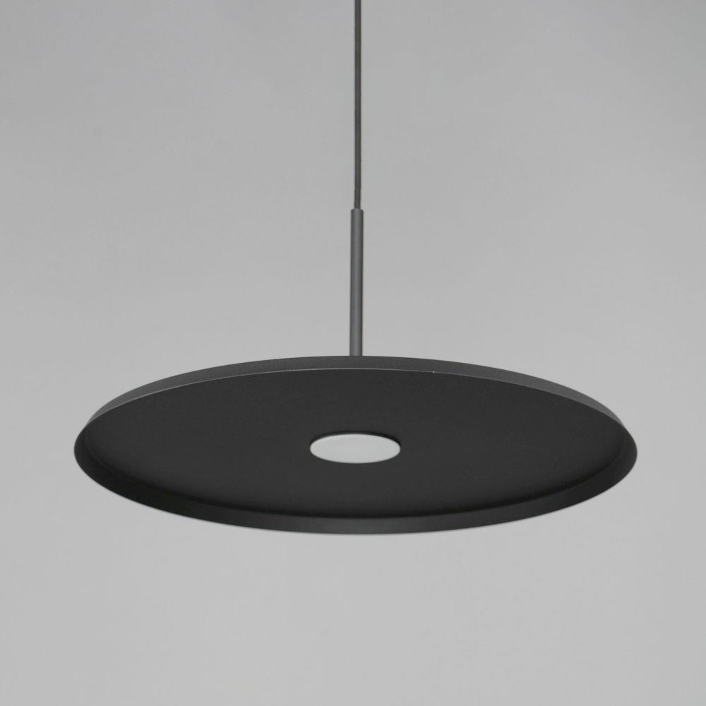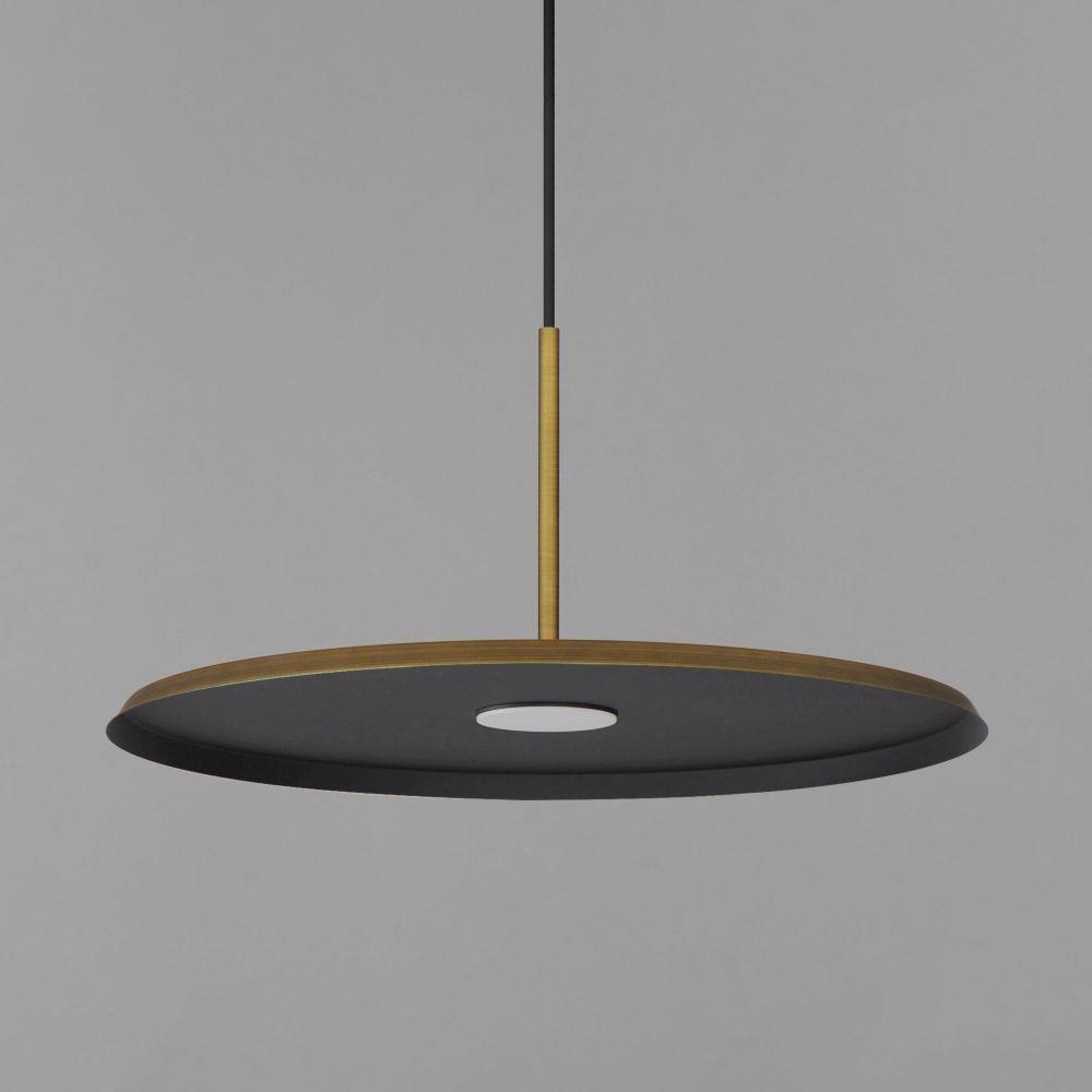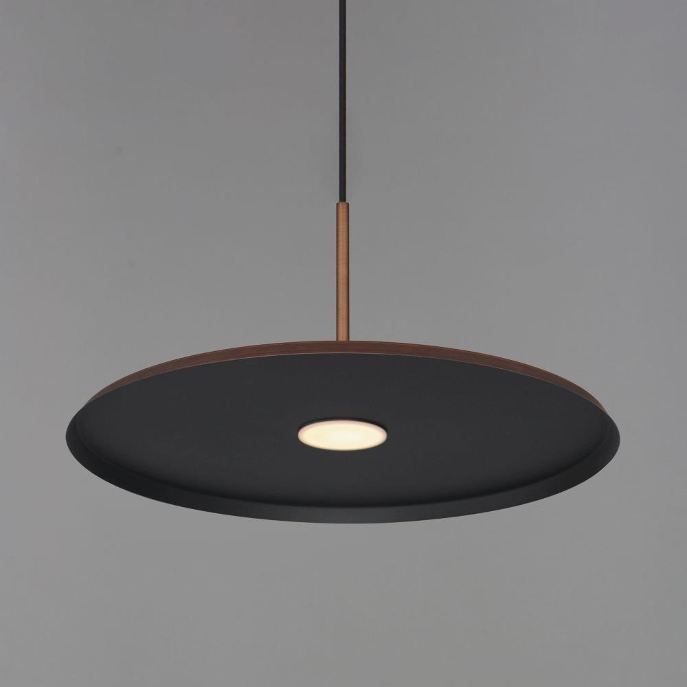 Wide flat discs house LED engines that disappear when viewed at the pendants edge. Supported at their center by thin tubes and black cable, machined aluminum housings feature laterally cut concentric circles drawing inspiration from the grooves in a vinyl record. Finished in your choice of Matte Black, Antique Brass, or Antique Copper, the modern design feels vintage and retro widening the range of compatibility within architectural aesthetics.
