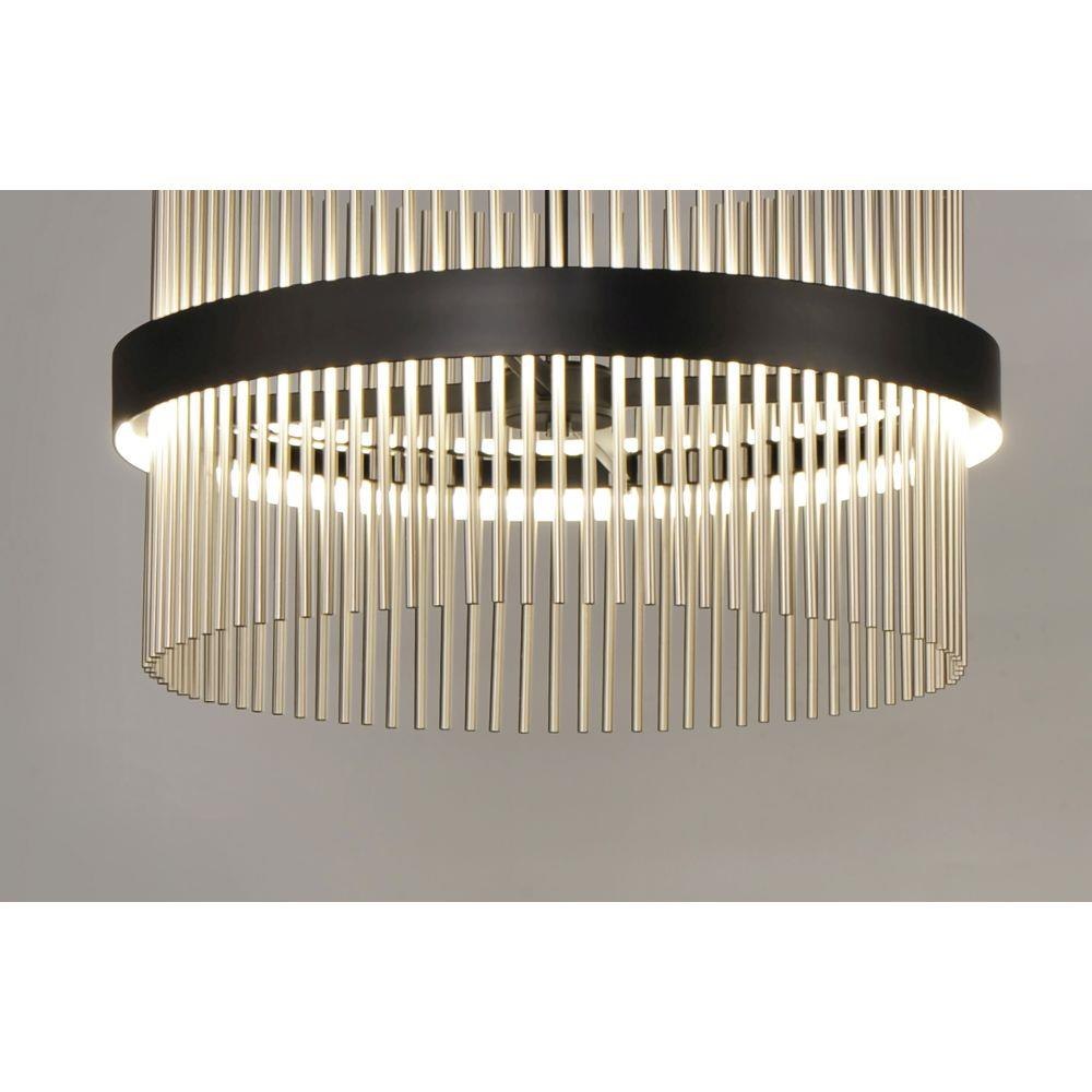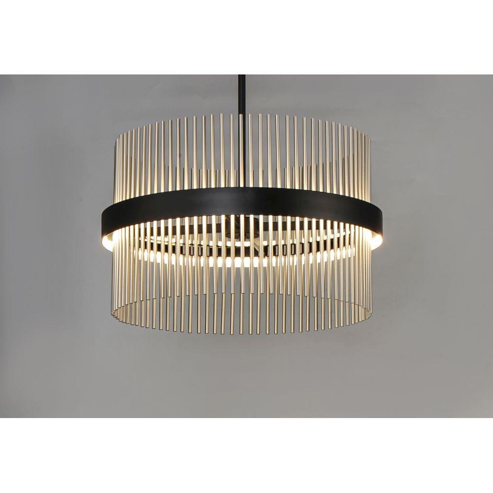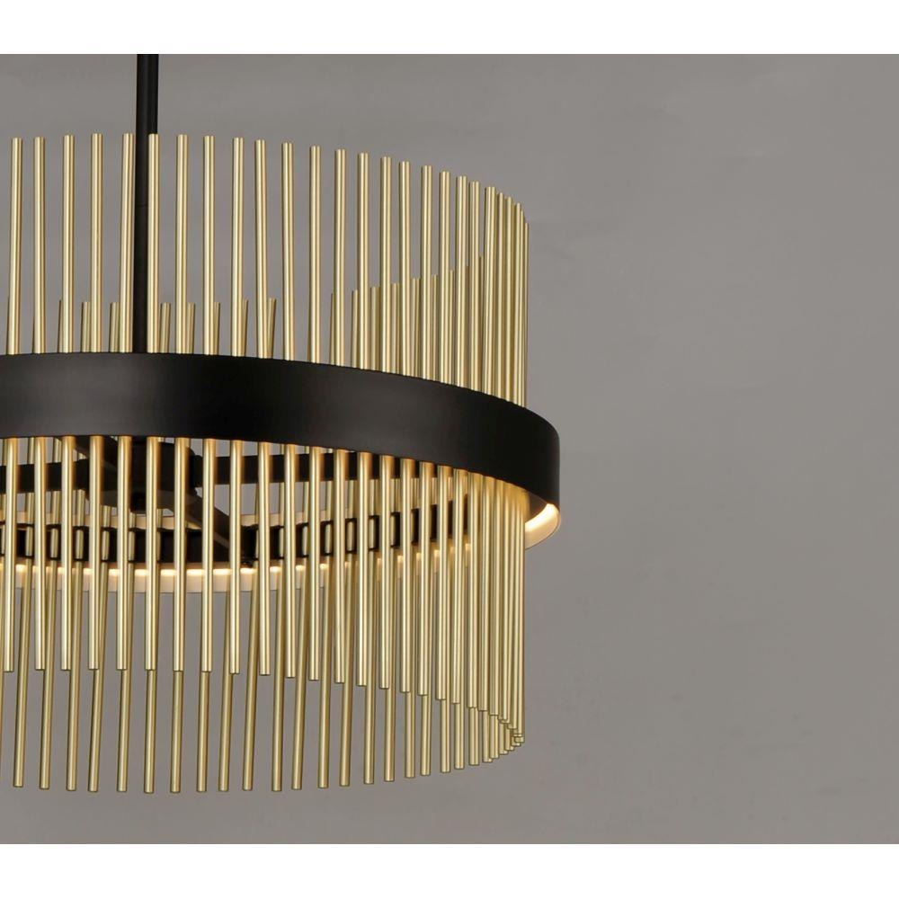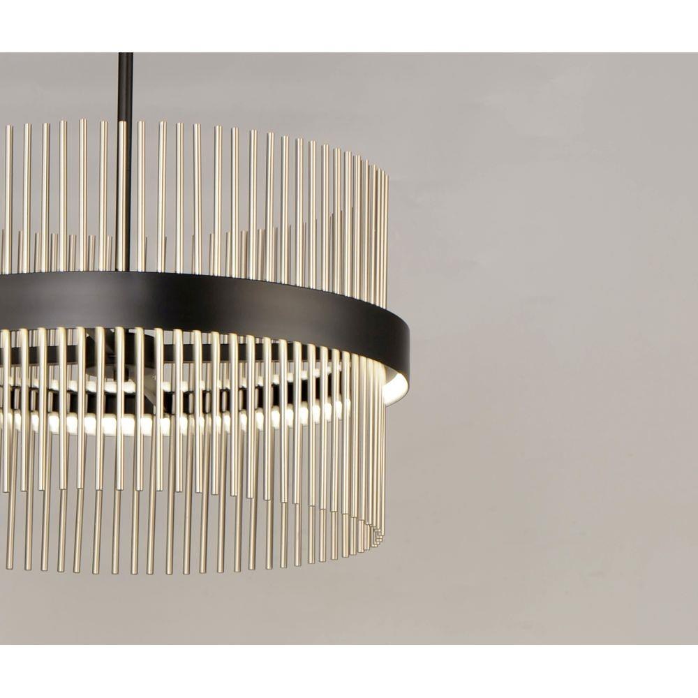 Round rings of Black support rows of tubing in your choice of Satin Brass, Satin Nickel or Satin Brass/Satin Nickel combined. The tubing comes to life when illuminated from the front by LED which directs light both up and down for even room illumination. The color temperature of the LED can be adjusted by any Bluetooth device to change the appearance of the fixture to suit any room decor.