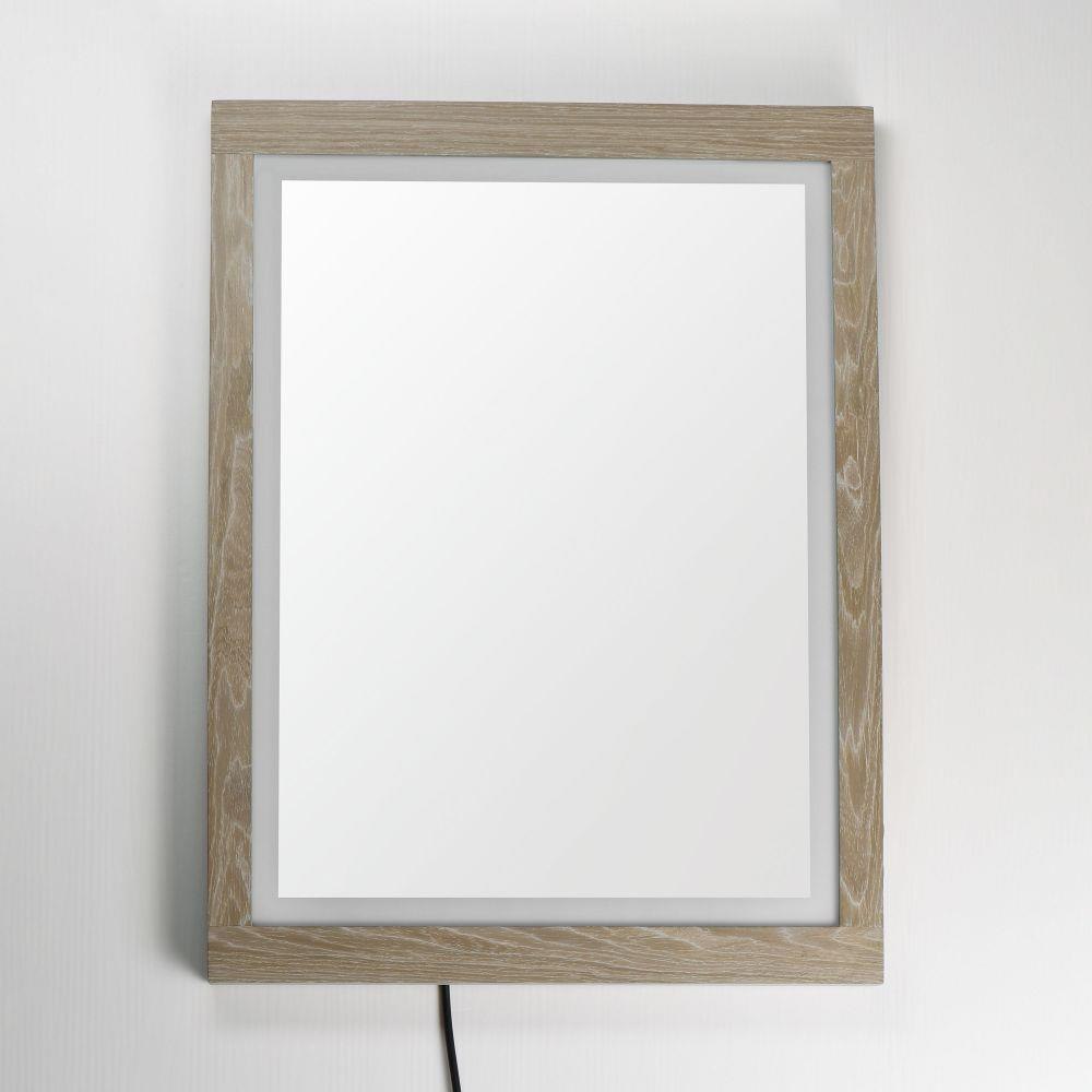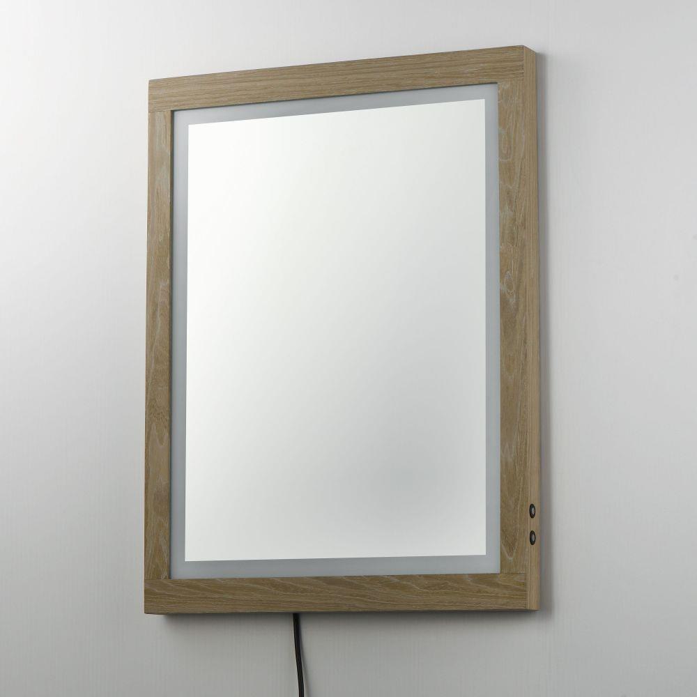 A wood-framed mirror is offered in a choice of Walnut or Distressed Oak, combining natural elements with modern functionality. A 2-inch frosted band along the frame's interior is backlit with LEDs, providing optimal illumination above a vanity. A discreetly hidden control along the edge of the frame allows easy selection between 3000K, 4000K, and 5000K color temperatures for personalized lighting.